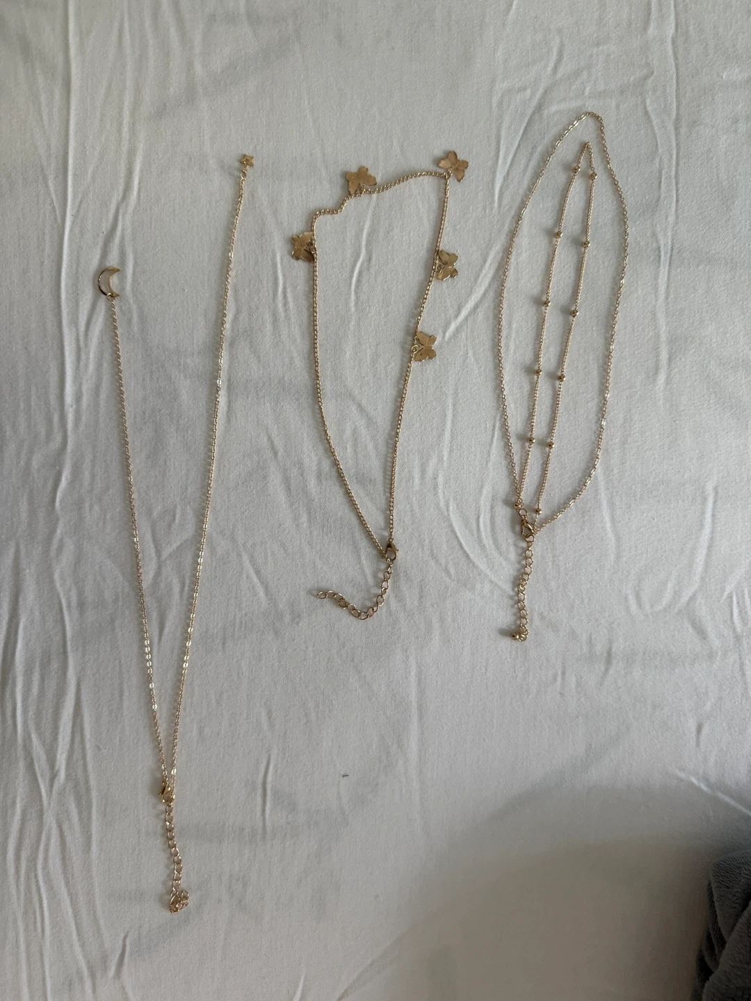 Selling a set of three gold-tone necklaces. They're in great condition and would make a lovely addition to any outfit! The set includes a necklace with a moon and star charm, a butterfly charm necklace, and a layered necklace with small bead accents Take all for$3