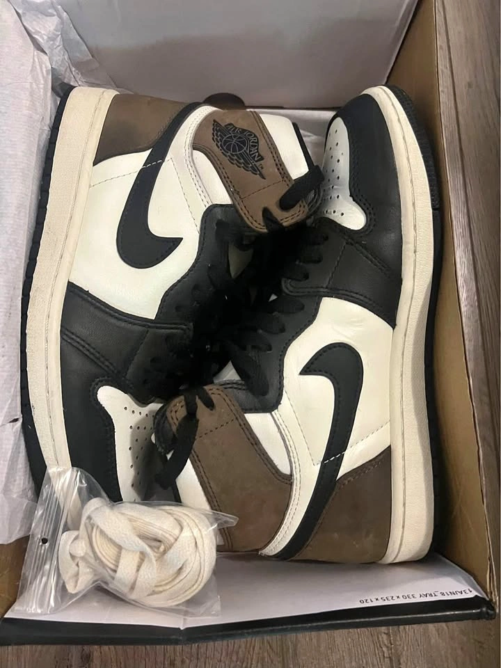 Pre-owned Nike Air Jordan 1 High OG 'Dark Mocha' sneakers. Black, white, and brown colourway. Comes with original box. The box is a little messed. Some wear and tear. But in decent condition. I am moving and I need it gone. Feel free to send any and all offers.