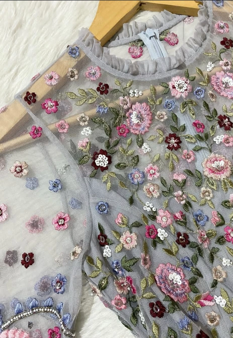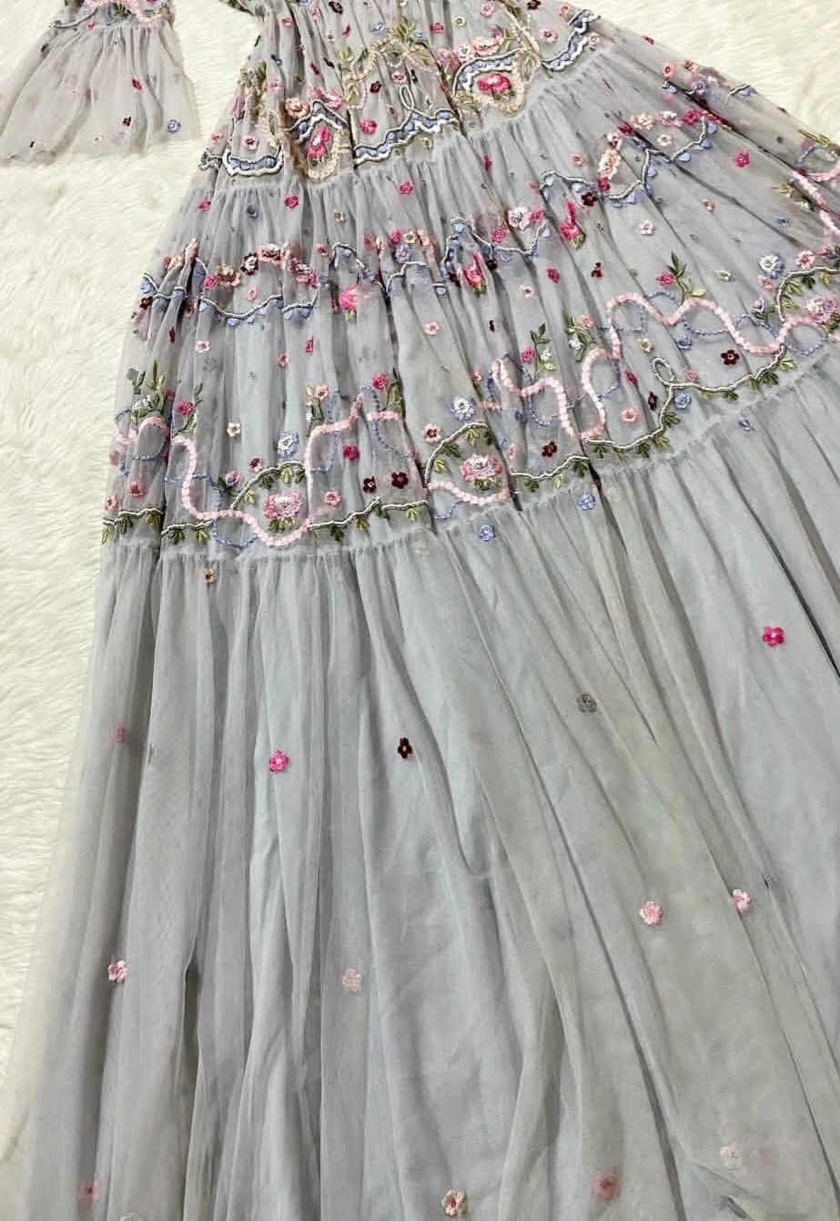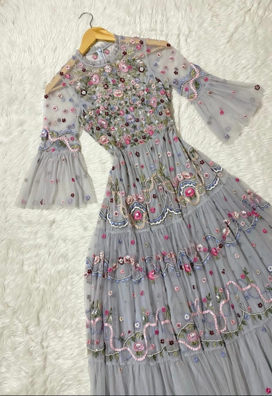 Beautiful Needle & Thread maxi dress with delicate floral embroidery. This dress features a tiered design and is perfect for special occasions or adding a touch of elegance to your wardrobe. The intricate detailing and flowing silhouette make it a standout piece