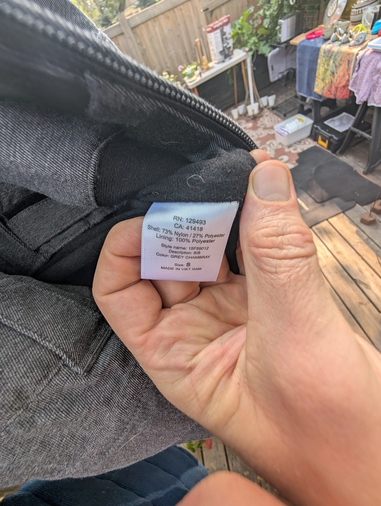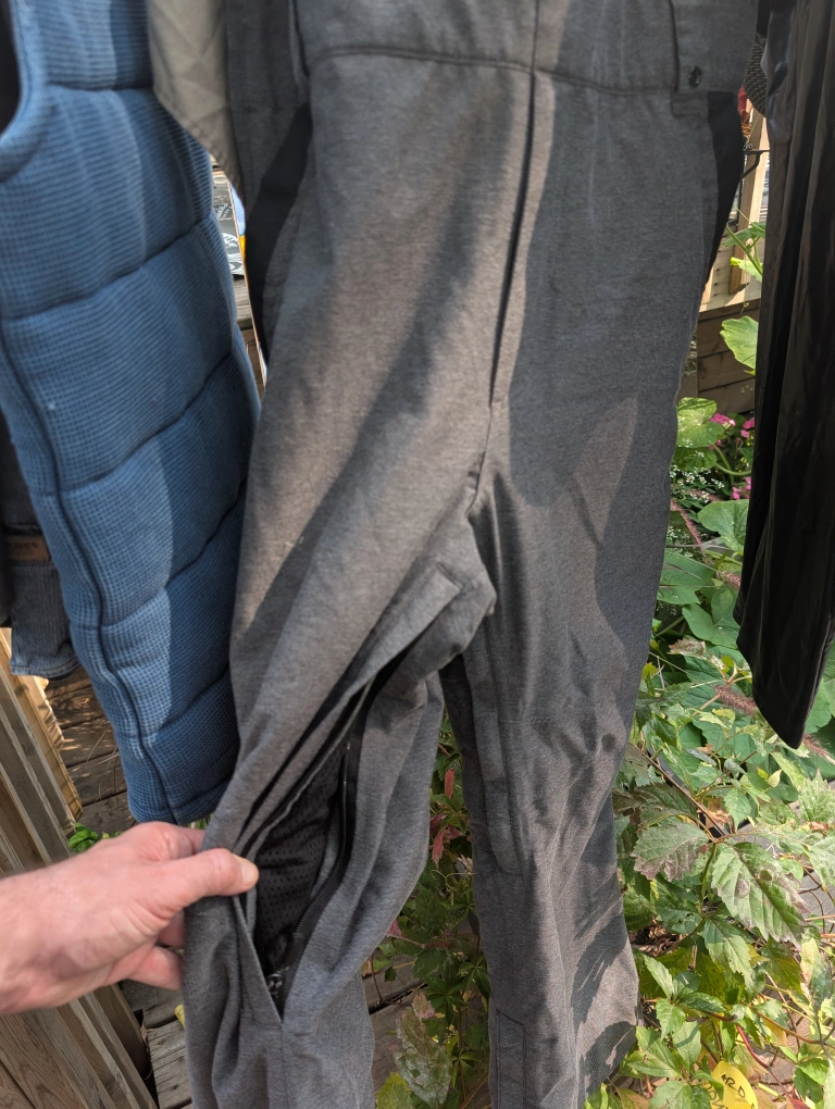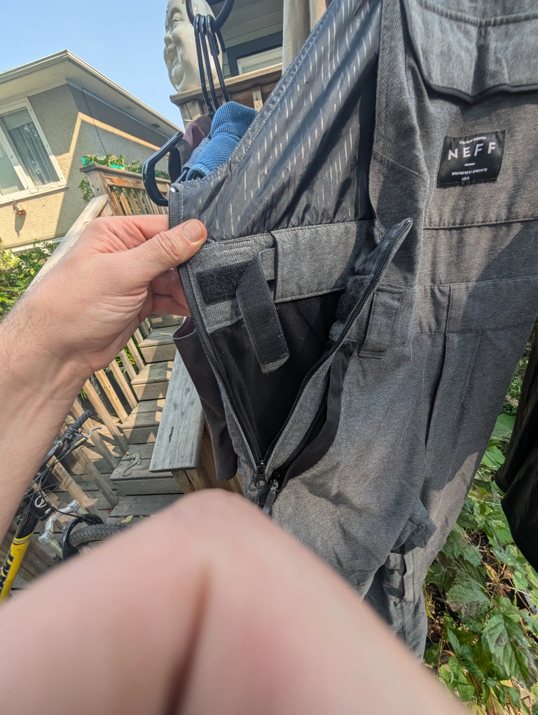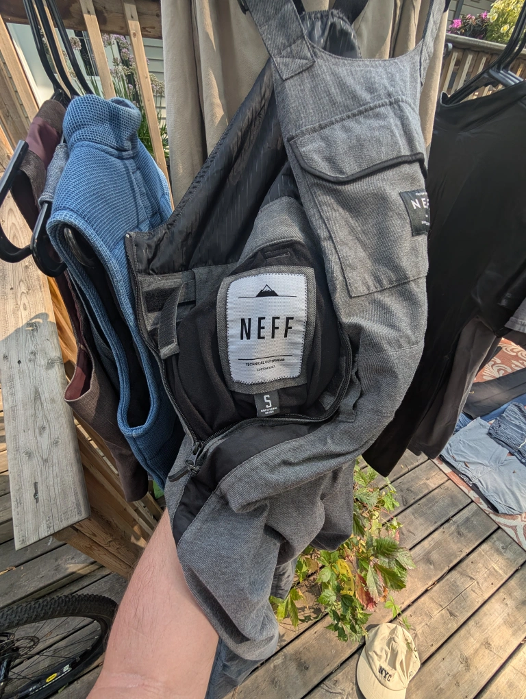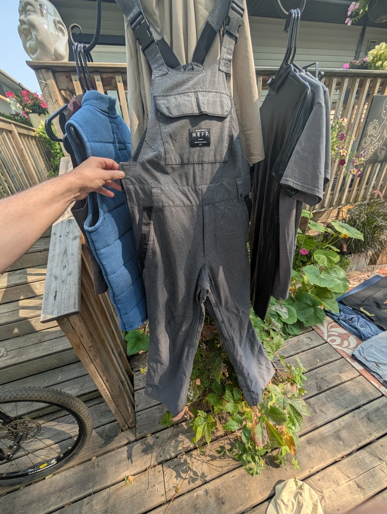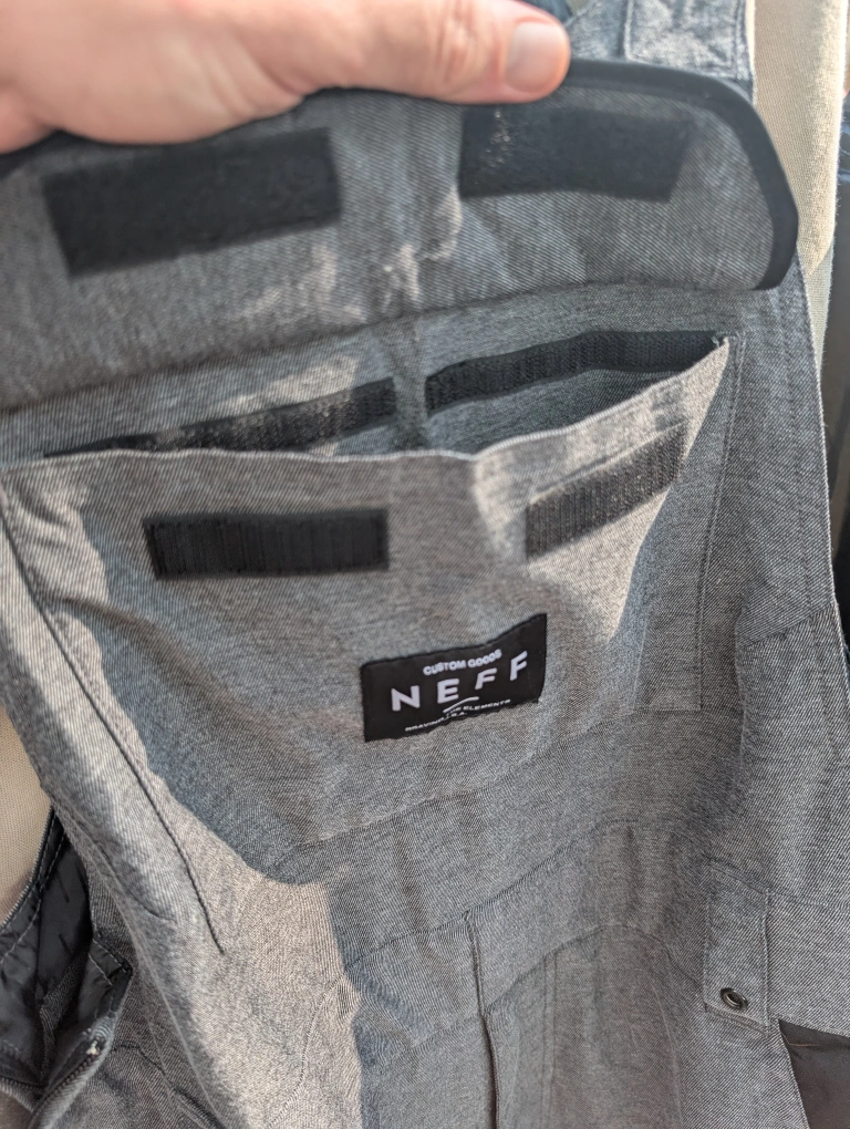 Here are some Neff snowboarding pants in a grey chambray colour. They are a size small. The shell is made of 73% nylon and 27% polyester. Integrated powder belt, gators and ventilation. Like new.