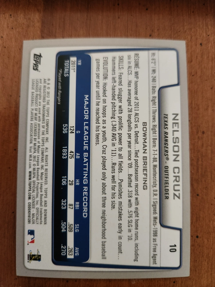 Selling a Nelson Cruz baseball card. It's from the 2011 season when he played for the Texas Rangers. The card details his stats, including games played, at-bats, runs, hits, home runs, and RBIs. A great addition for any baseball fan or card collector