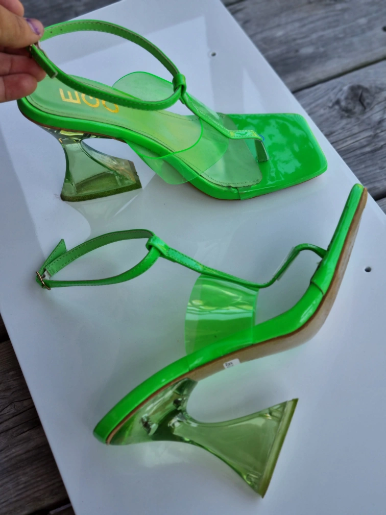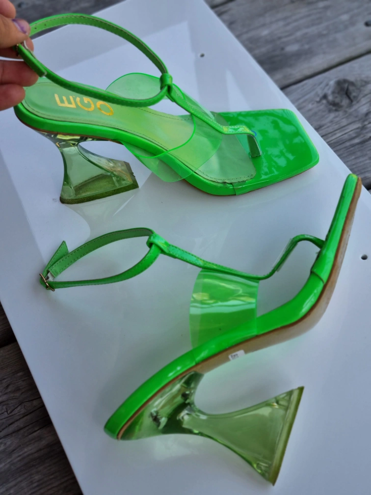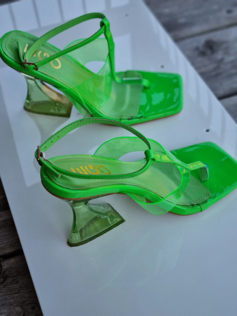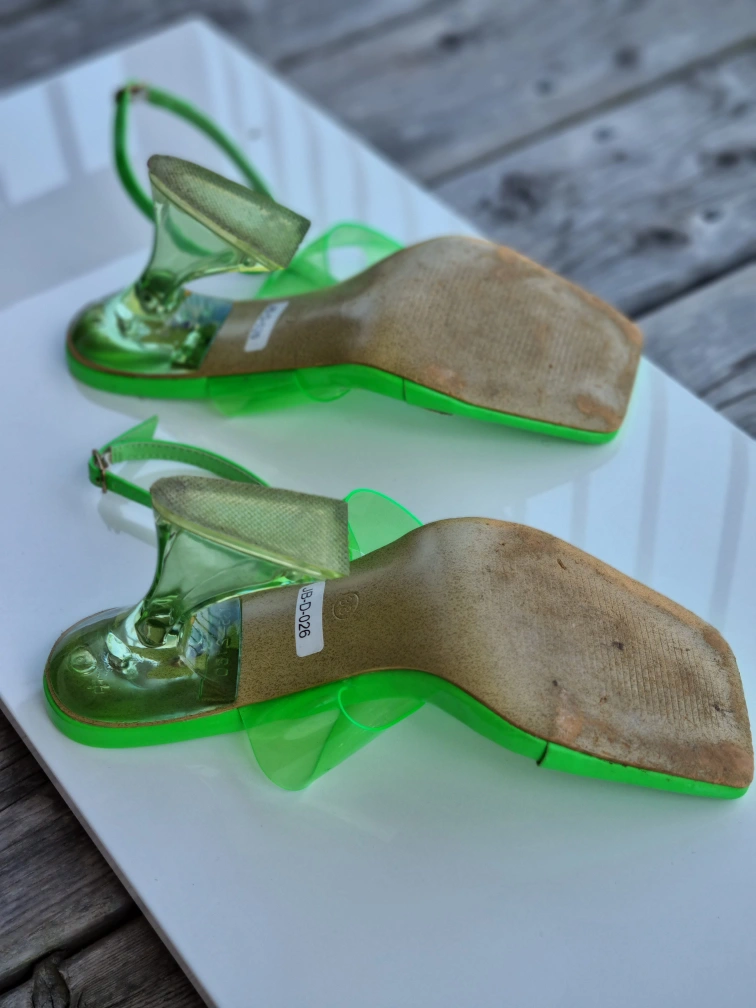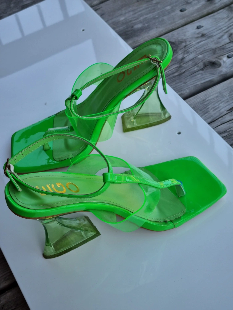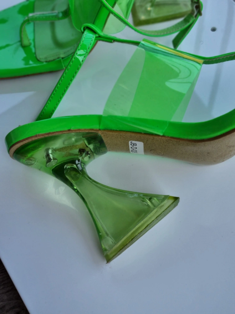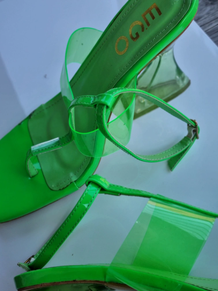 Bright green sandals. Features a clear strap and heel. Perfect for a summery day. I think you'll like these for a walk along the beach.