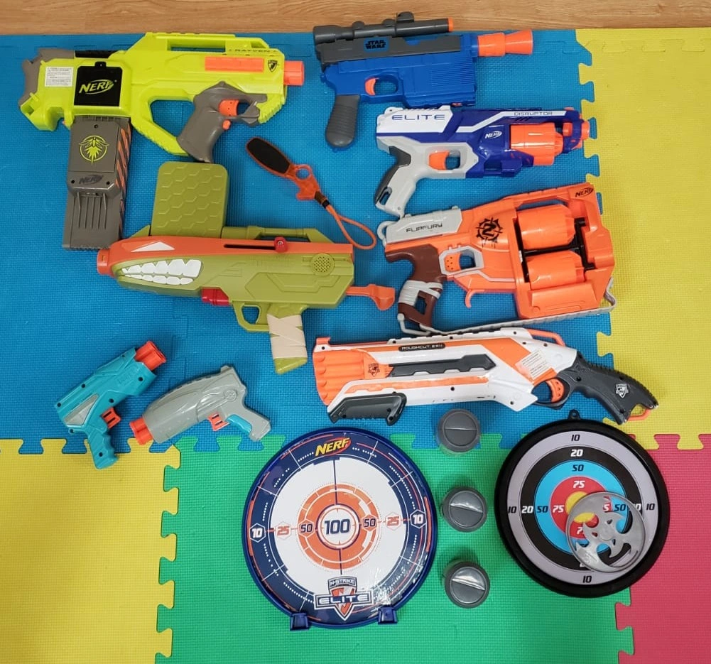 Large collection of Nerf blasters, including Elite and Star Wars models. Two targets included. Great for Nerf battles.