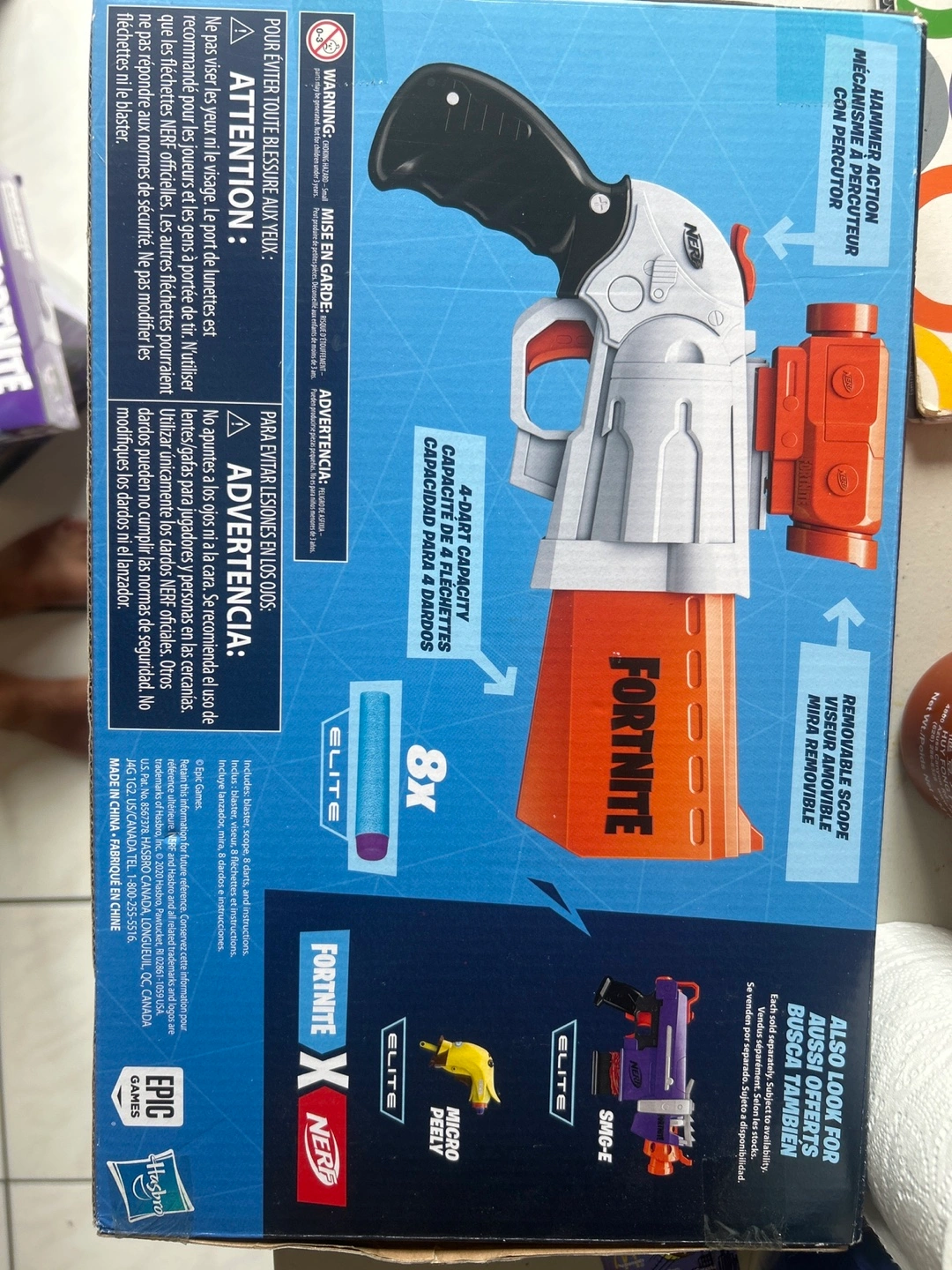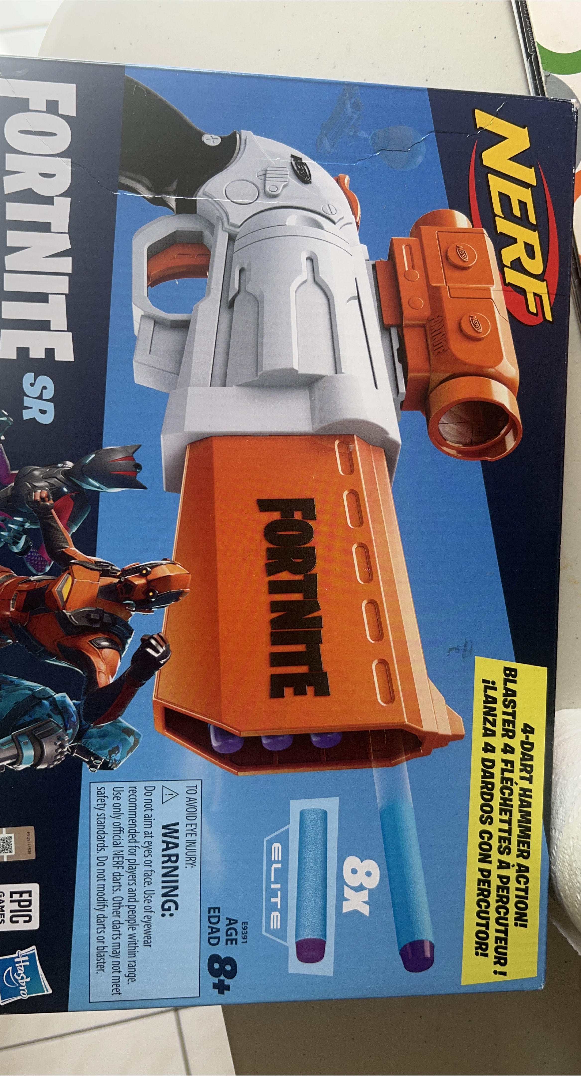 Nerf Fortnite SR dart blaster, perfect for kids aged 8 and up! It features a 4-dart hammer action. Includes 8 Elite darts. Get ready for some fun!