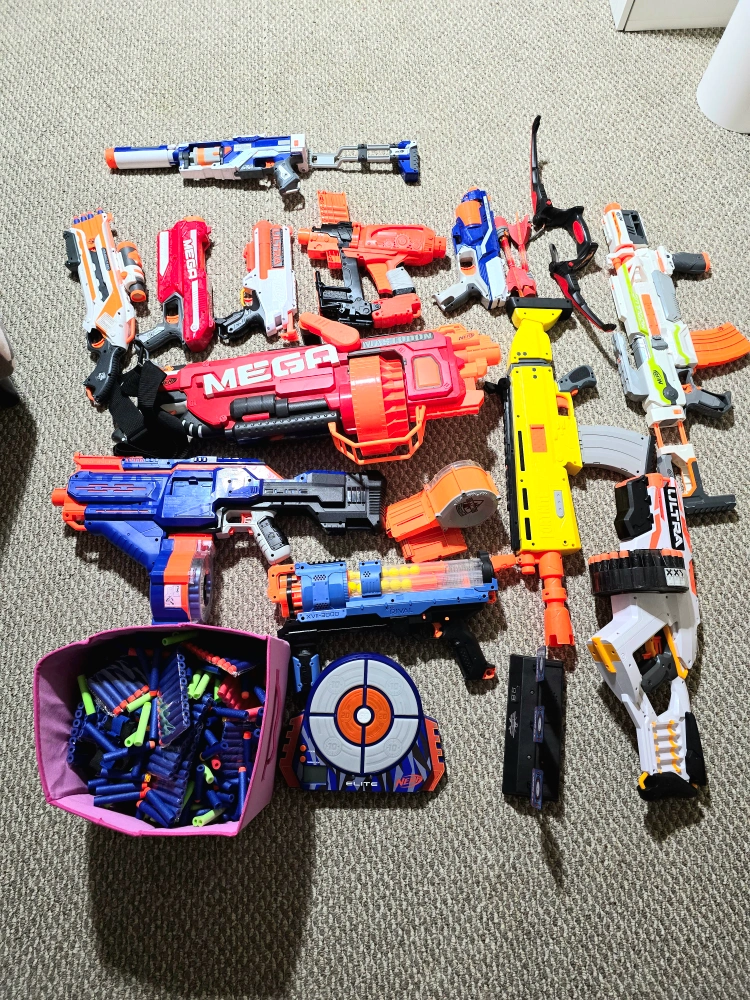 Selling a large collection of Nerf guns! Includes various models such as Mega, Ultra, Elite, and Rival. Somw manual and somw battery operated. Comes with a bucket of darts and a target. Great for kids and Nerf enthusiasts!