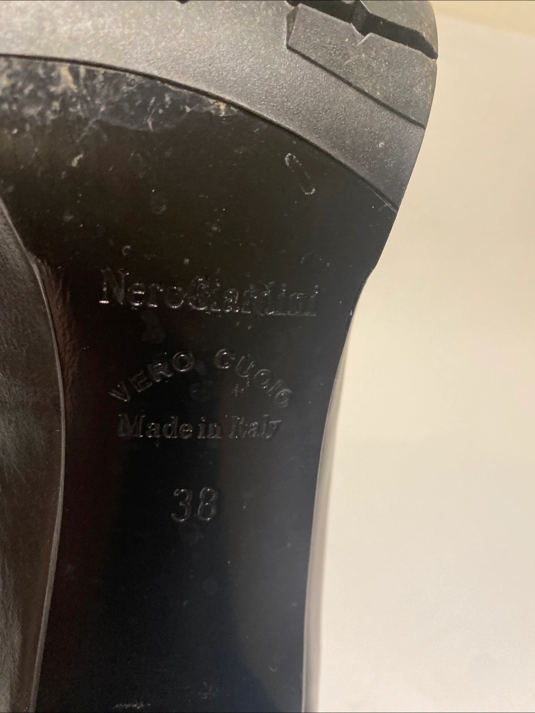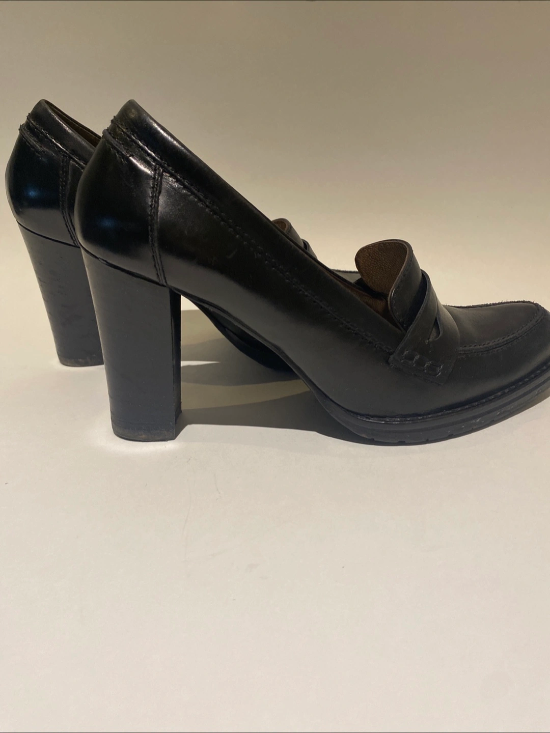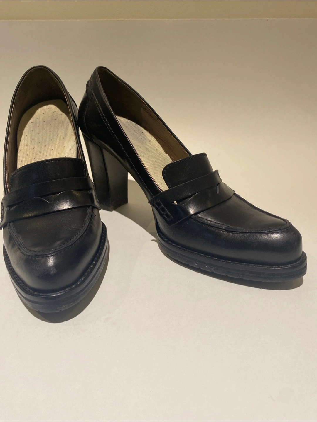 Made in Italy. Pair of black leather heeled loafers. Size 38. Slight wear. Good condition. Sad to part with these but I can’t wear heels anymore. Only ever worn with removable insoles.