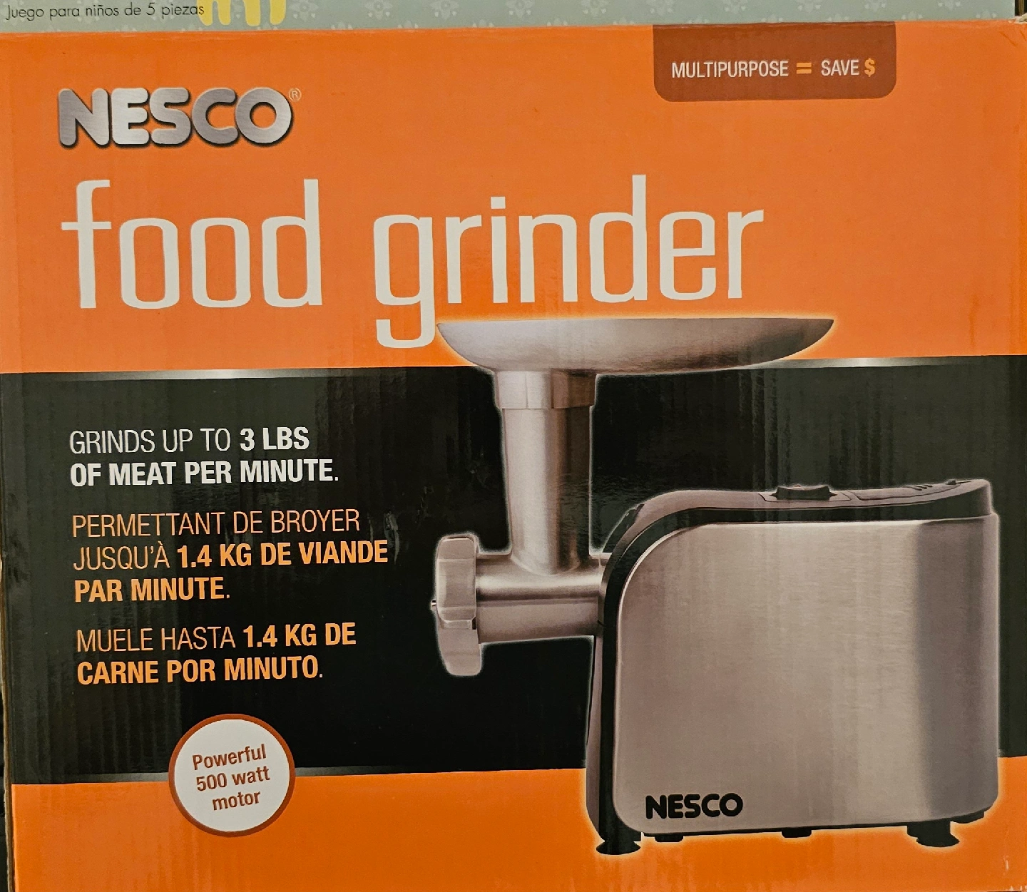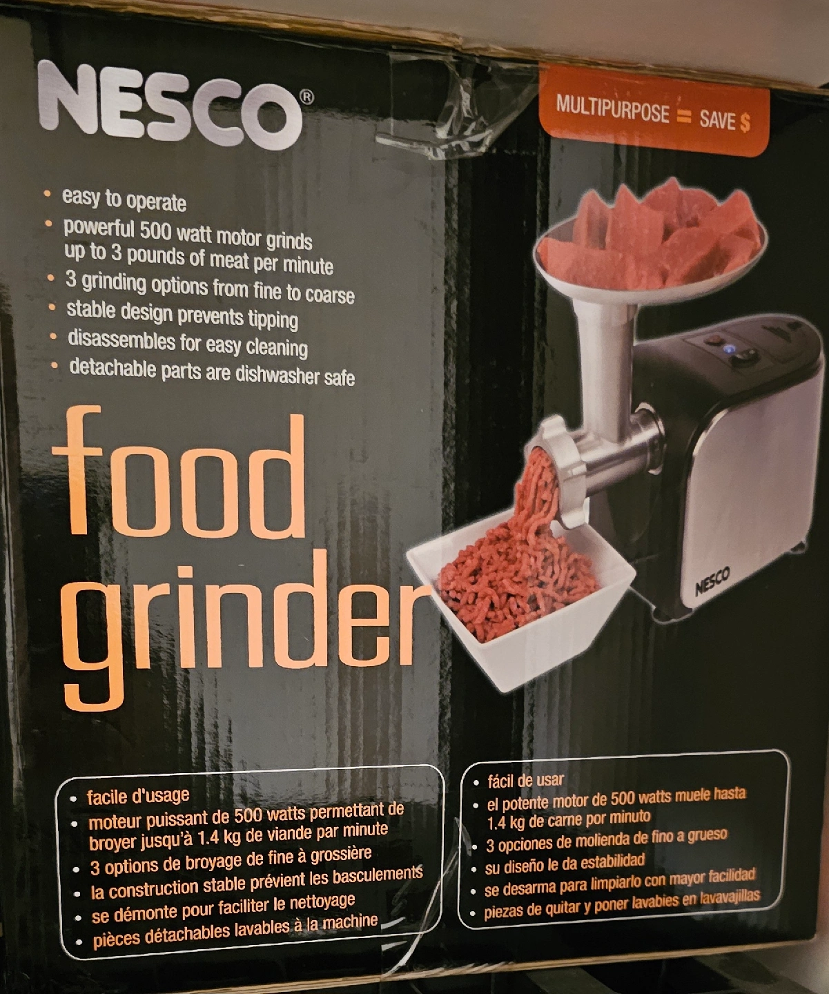 I'm selling a Nesco food grinder! It's easy to operate and has a powerful 500 watt motor that grinds up to 3 pounds of meat per minute. Here are some of its features: - 3 grinding options from fine to coarse - Stable design prevents tipping - Disassembles for easy cleaning - Detachable parts are dishwasher safe