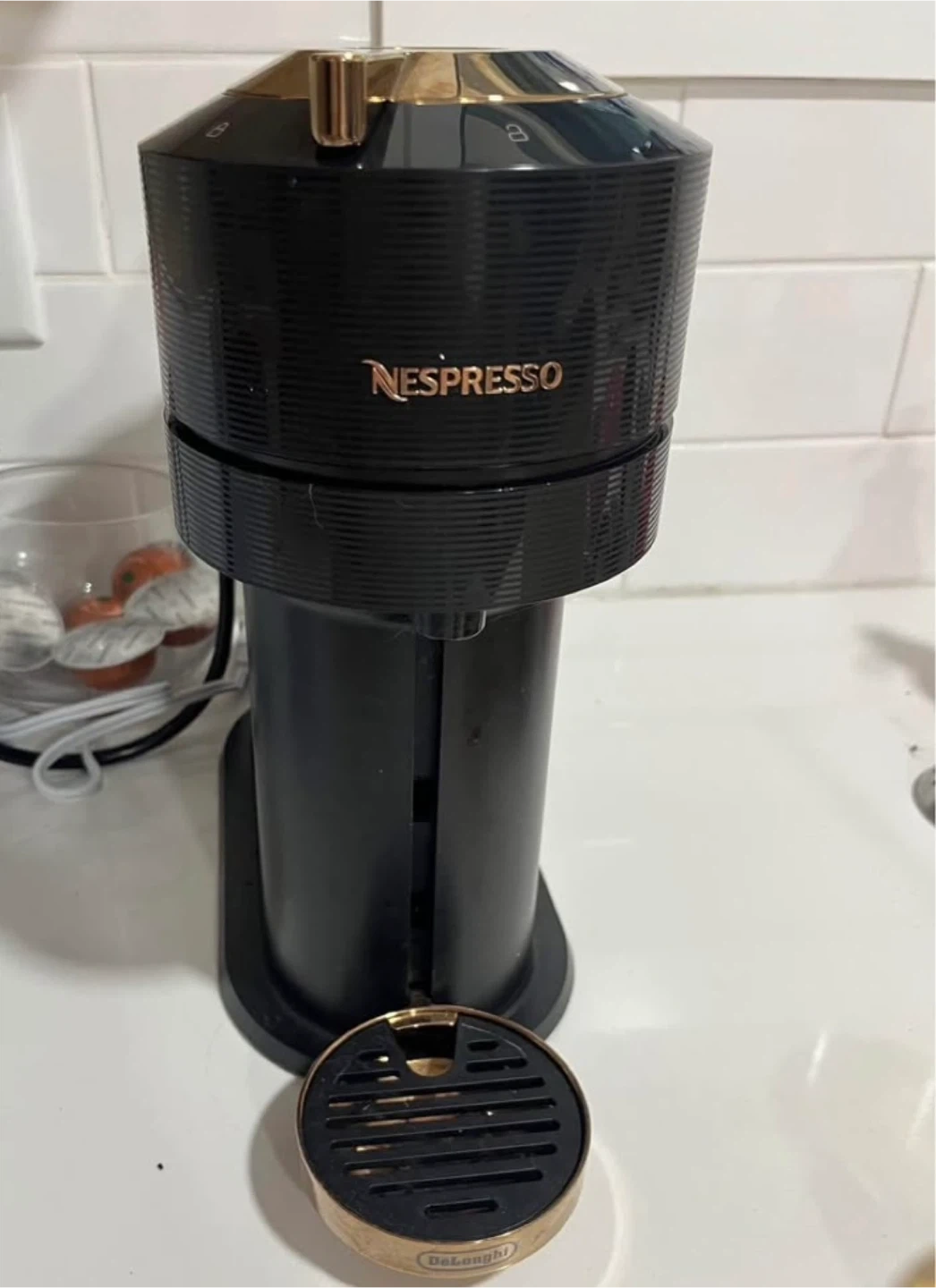 Selling a Nespresso Vertuo Next coffee machine in black with gold accents. It's in great condition and ready to make delicious coffee at home! Enjoy the convenience of Nespresso's capsule system with this stylish machine