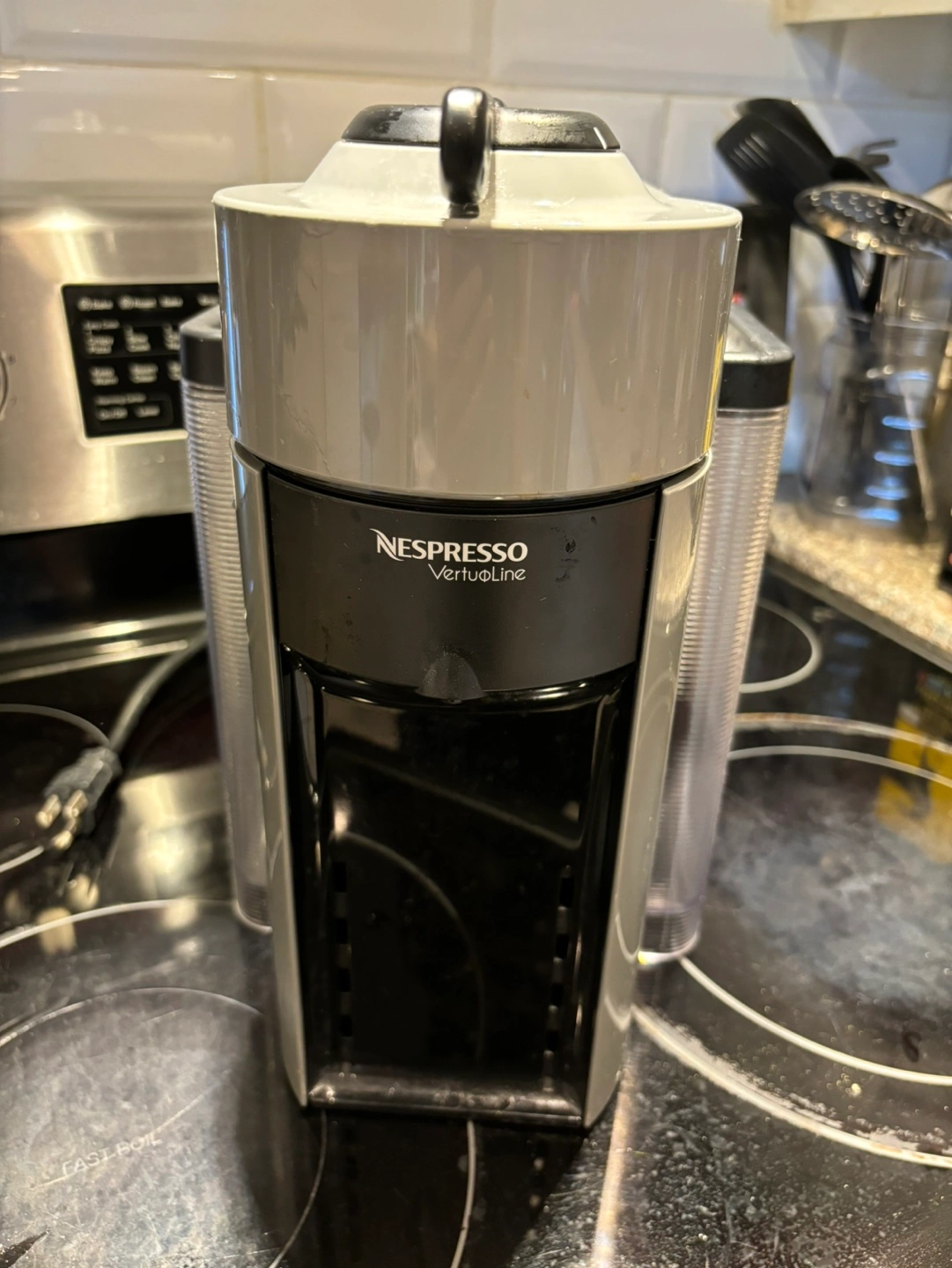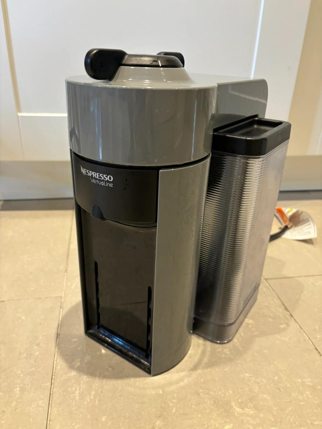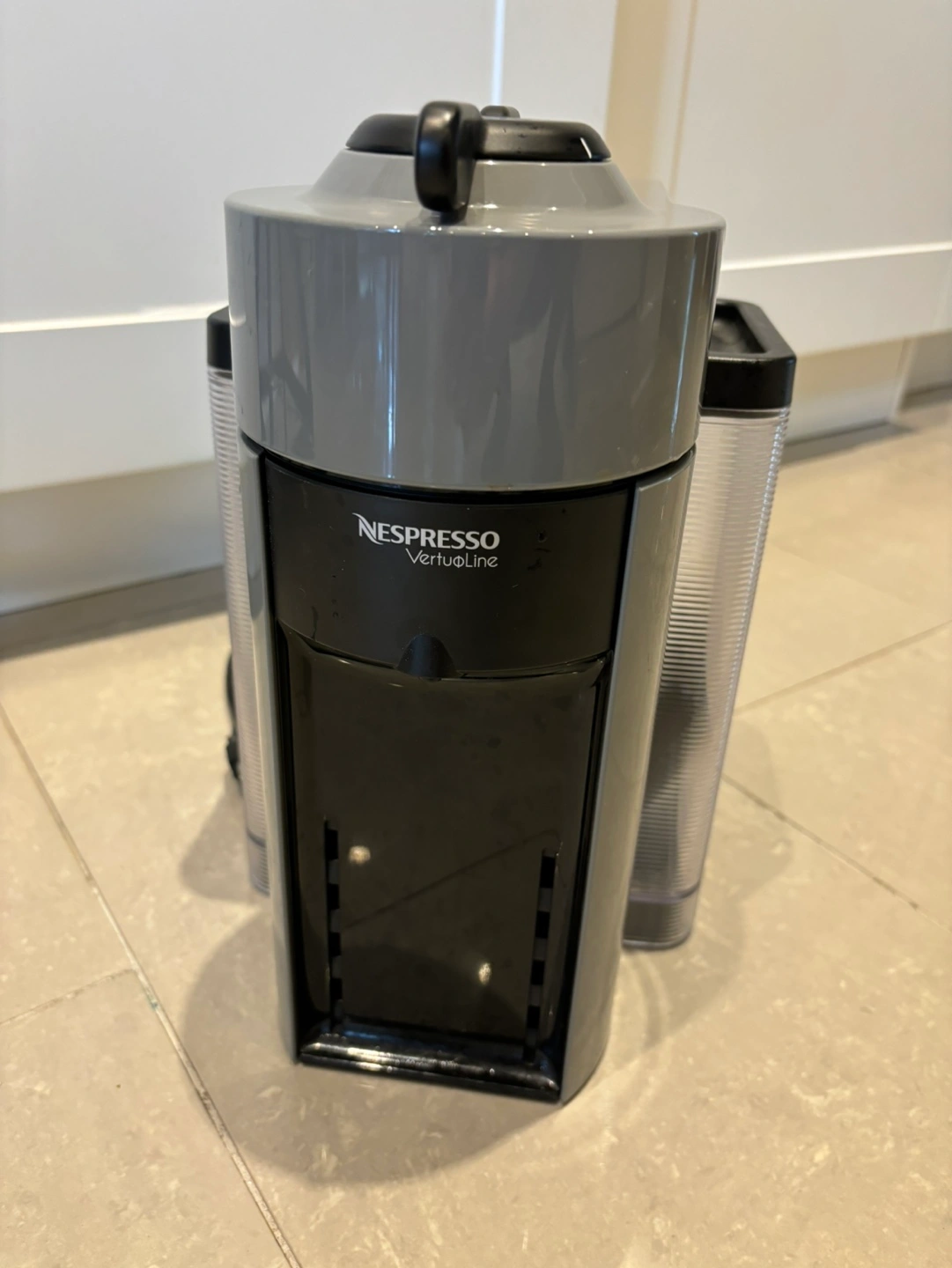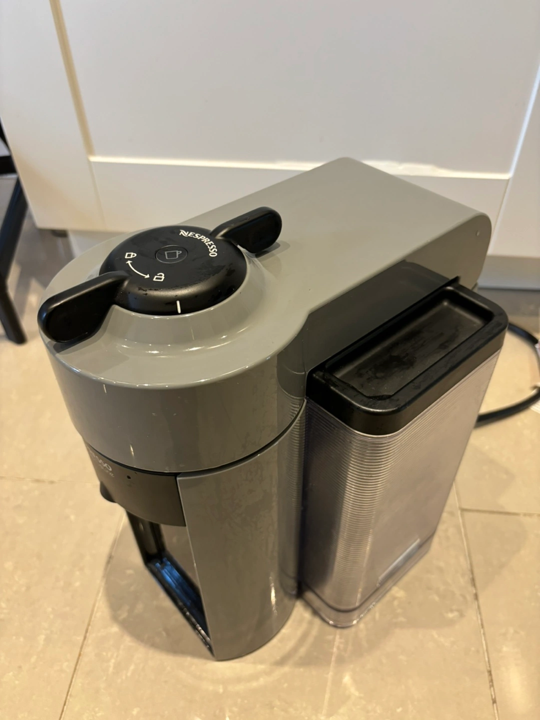 Grey Nespresso VertuoLine coffee maker. Includes water tank and drip tray. Makes coffee, espresso, and latte. Used, in good condition.