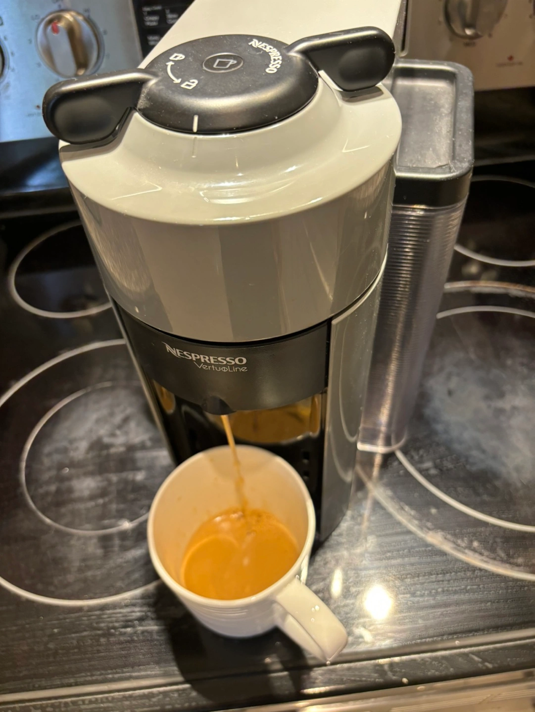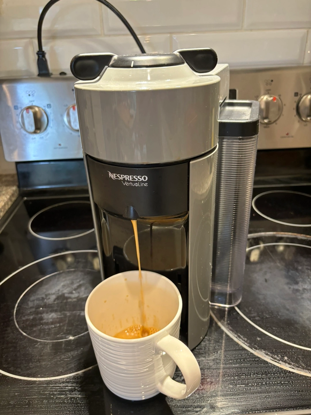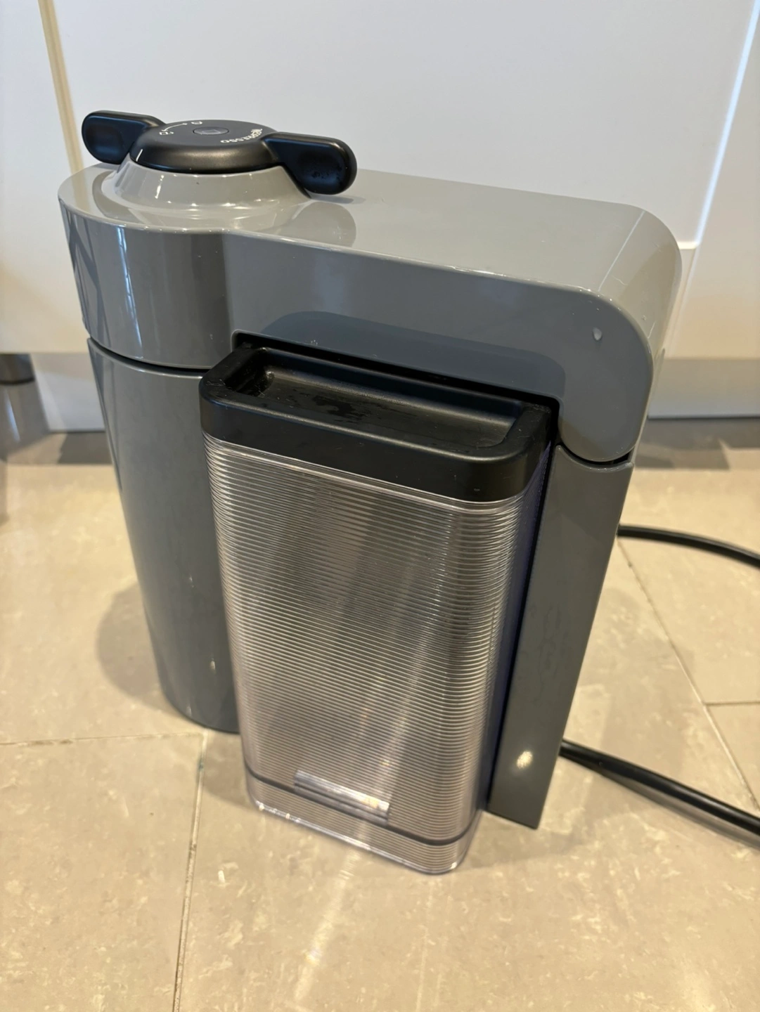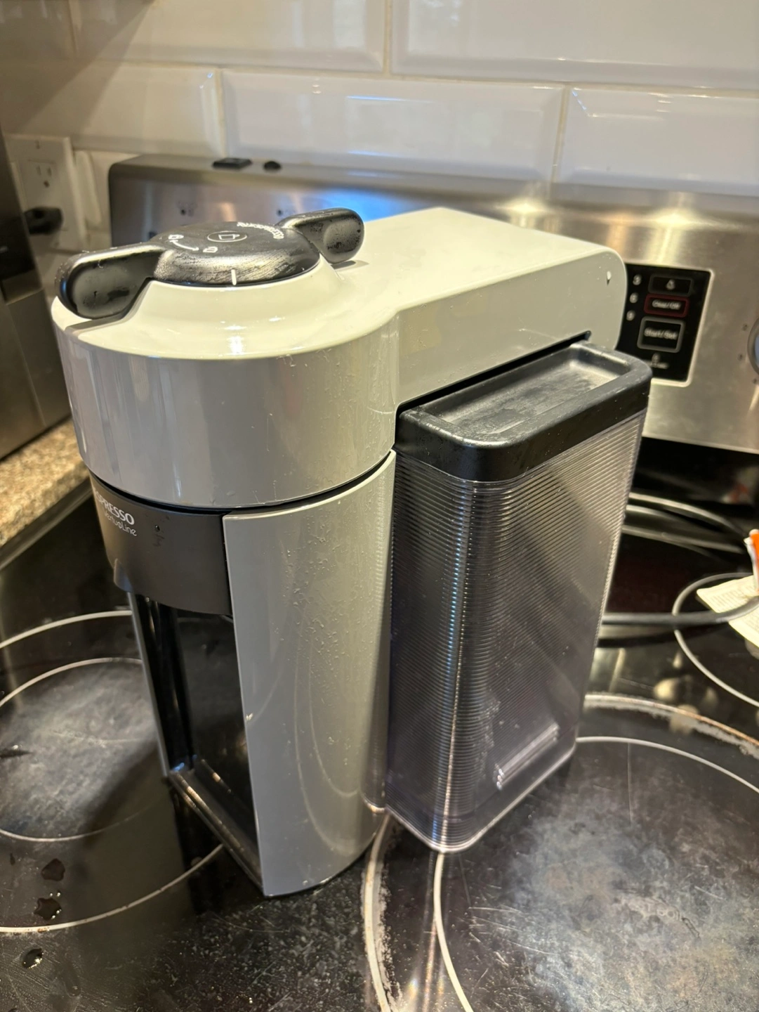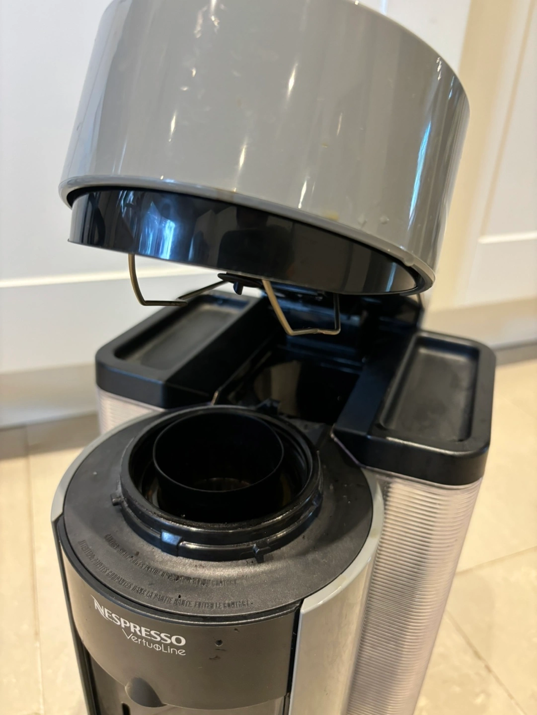 Grey Nespresso VertuoLine coffee maker. Includes water tank and drip tray. Makes coffee, espresso, and latte. Used, in good condition.