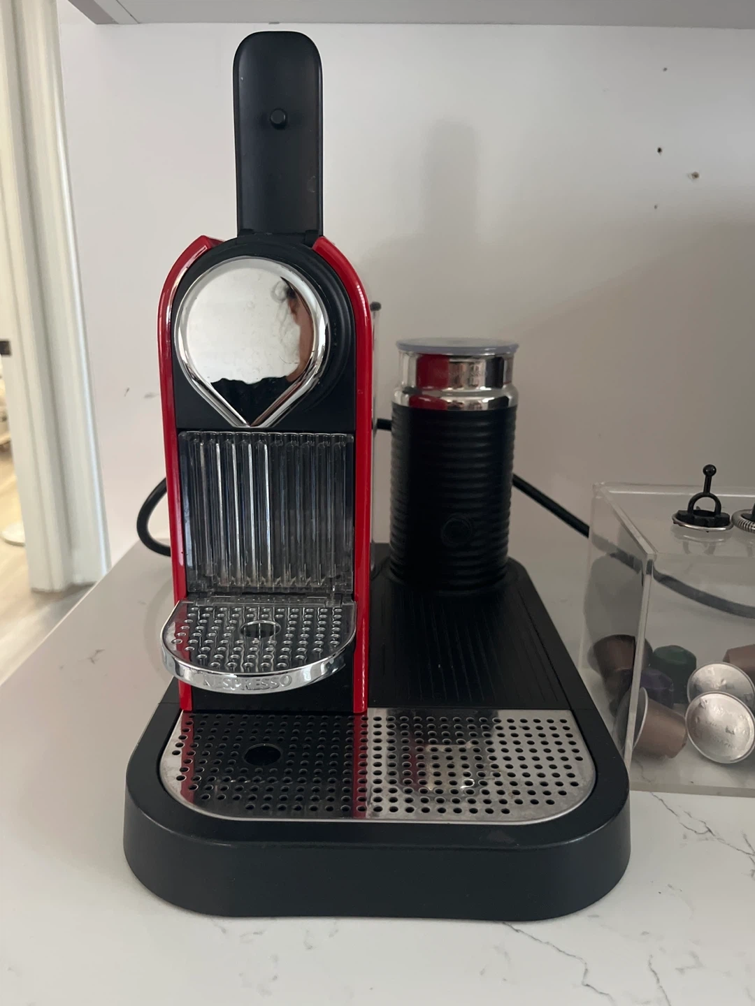 Selling a Nespresso CityZ coffee machine in red, complete with the Aeroccino milk frother! It comes with a pod holder as well. Great for making lattes and cappuccinos at home