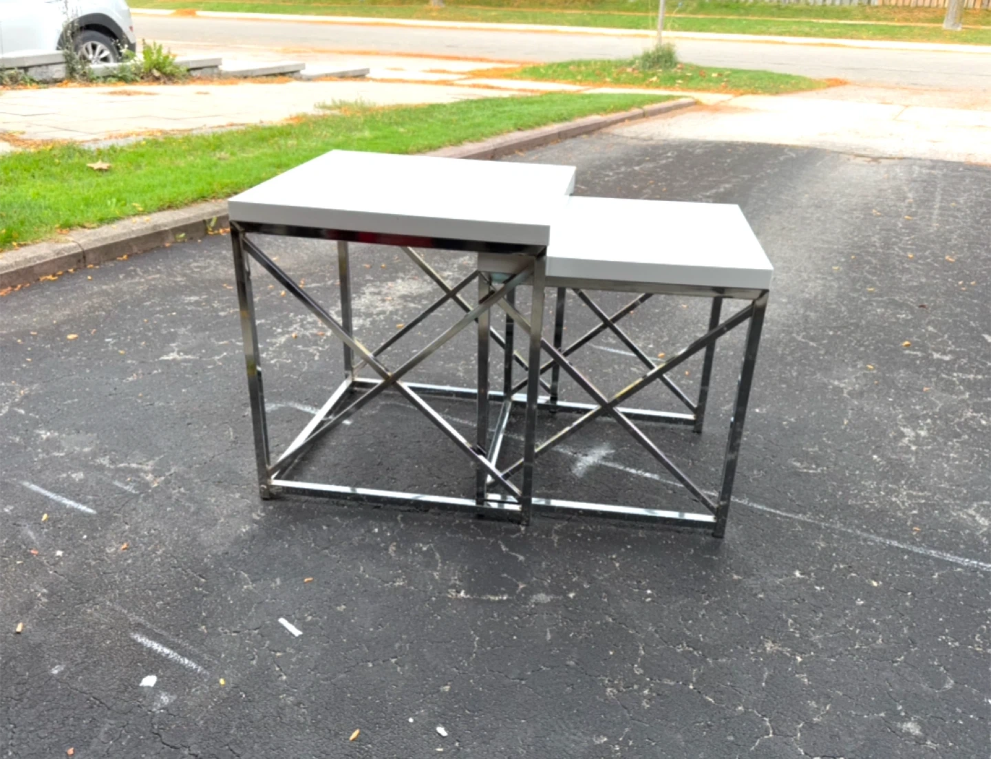 Selling a set of nesting side tables. They feature a modern design with chrome frames and white tops. Perfect for adding a stylish touch to your living space or bedroom!