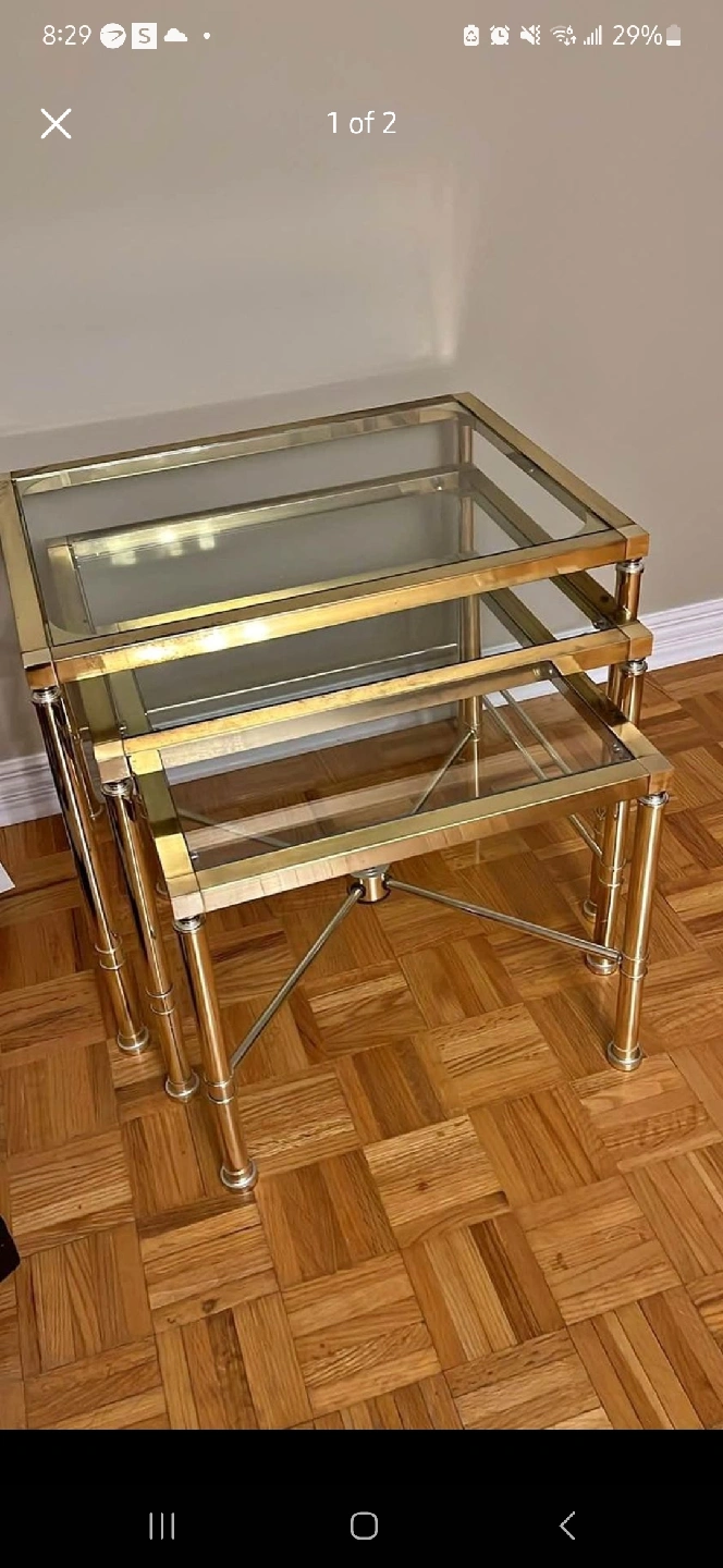 Selling a set of nesting tables with a brass frame and glass tops. These tables are perfect for adding a touch of elegance to any room and can be easily stored when not in use. They're in good condition!