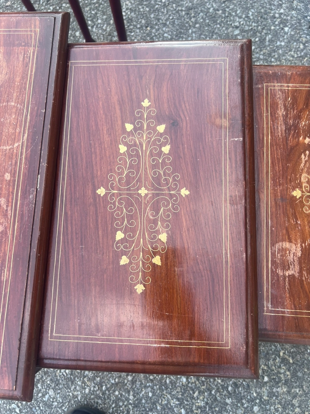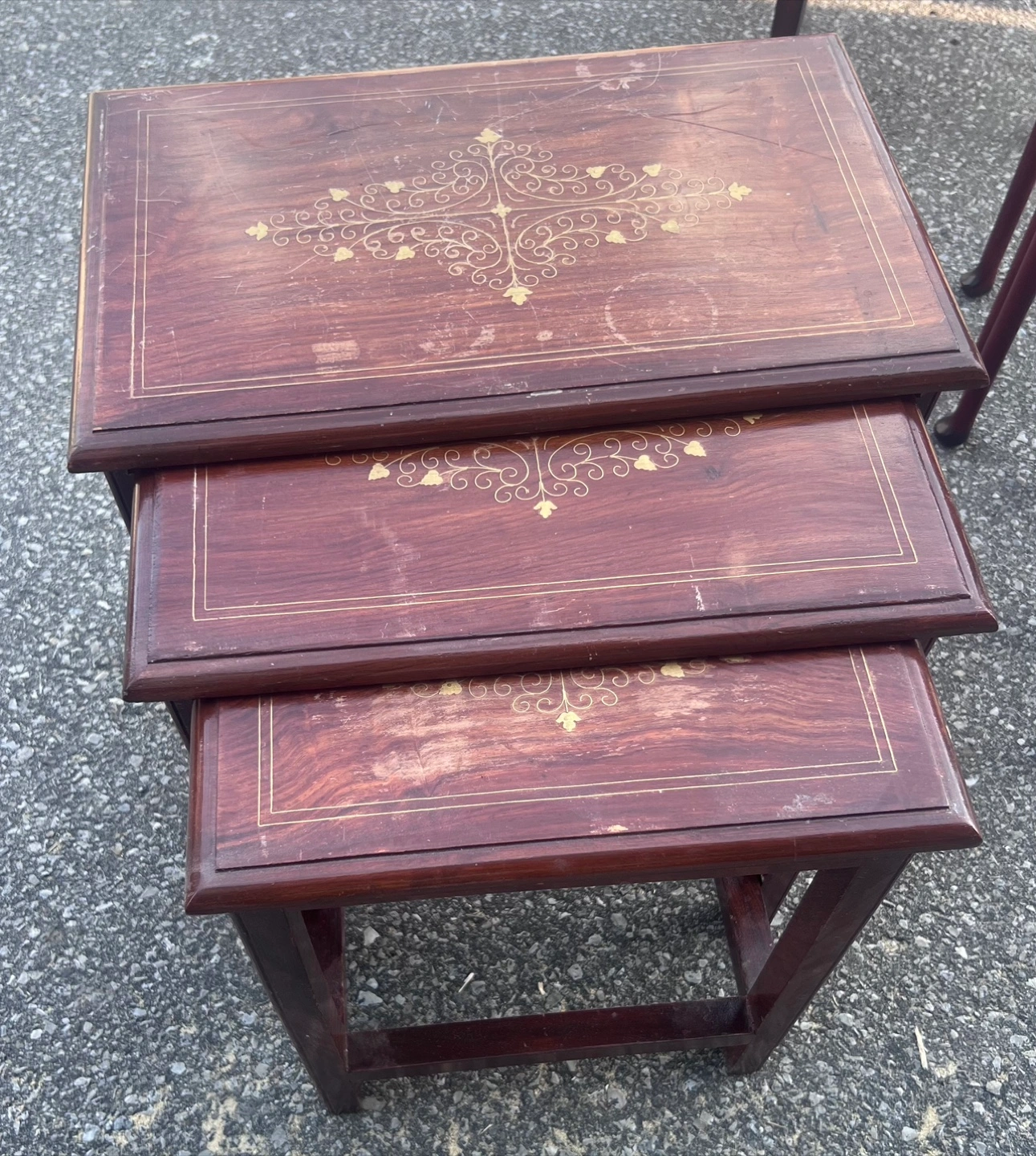 Selling a set of three nesting tables. They have a beautiful wood finish with a unique gold design on top. These tables are perfect for adding a touch of elegance to any room. They show some signs of wear, but are still in great condition for use!