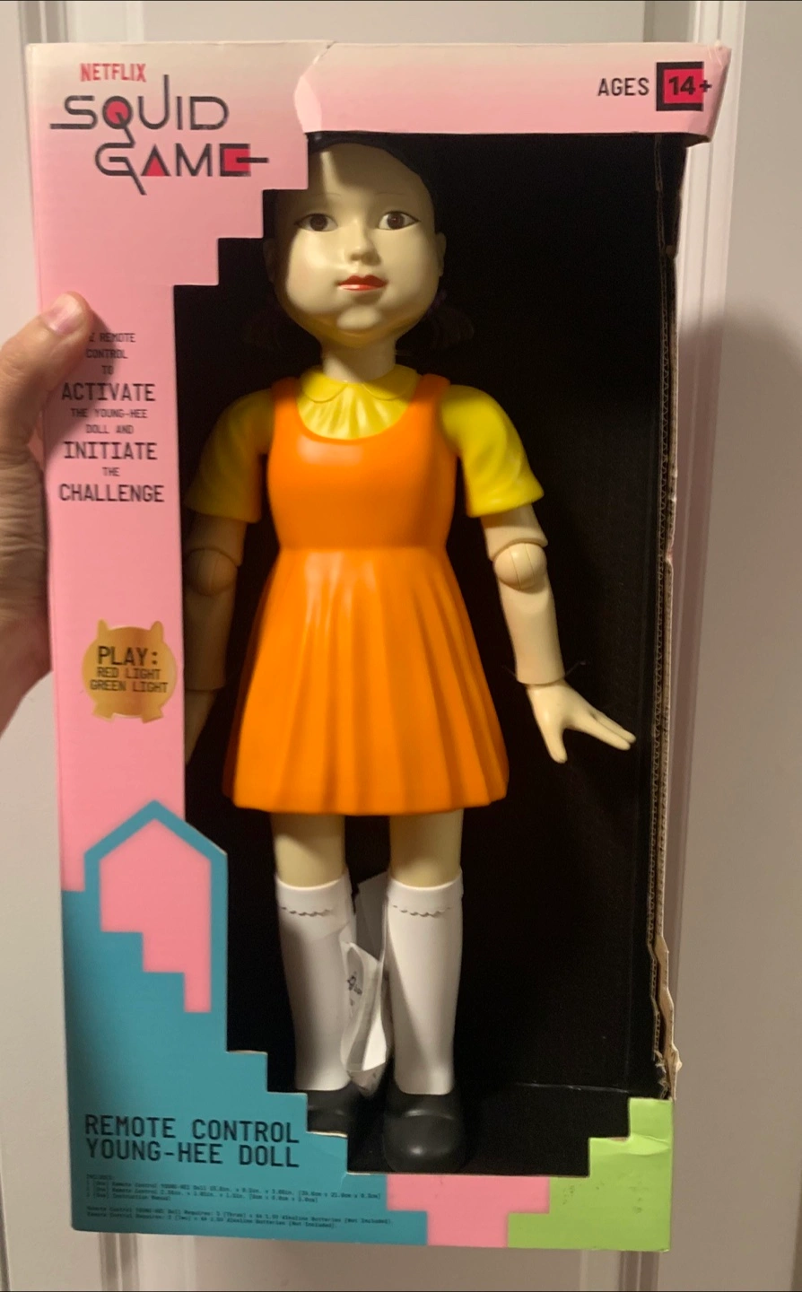 Selling a remote control Young-Hee doll from Netflix's Squid Game! The doll plays the red light, green light game and features realistic sound effects. The head rotates 180 degrees and the arms move 90 degrees. The doll's eyes also light up! This new, in-box Squid Game doll is ready to play 'Red Light, Green Light' in your home! Bring the thrilling world of the Netflix series to life with this remote-controlled Young-hee doll. Perfect for fans and collectors alike. It comes with a remote to activate the doll. * Remote Control Included * Officially Licensed Netflix Merchandise * For ages 14+
