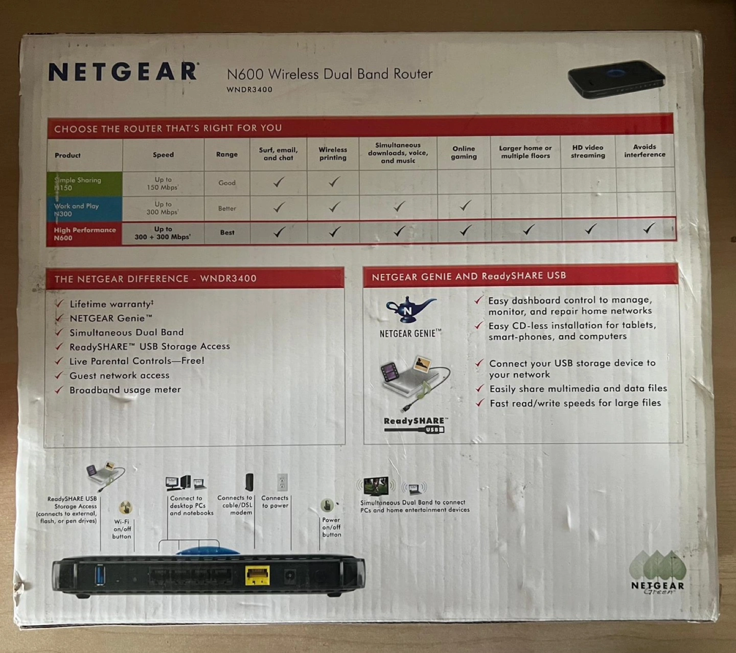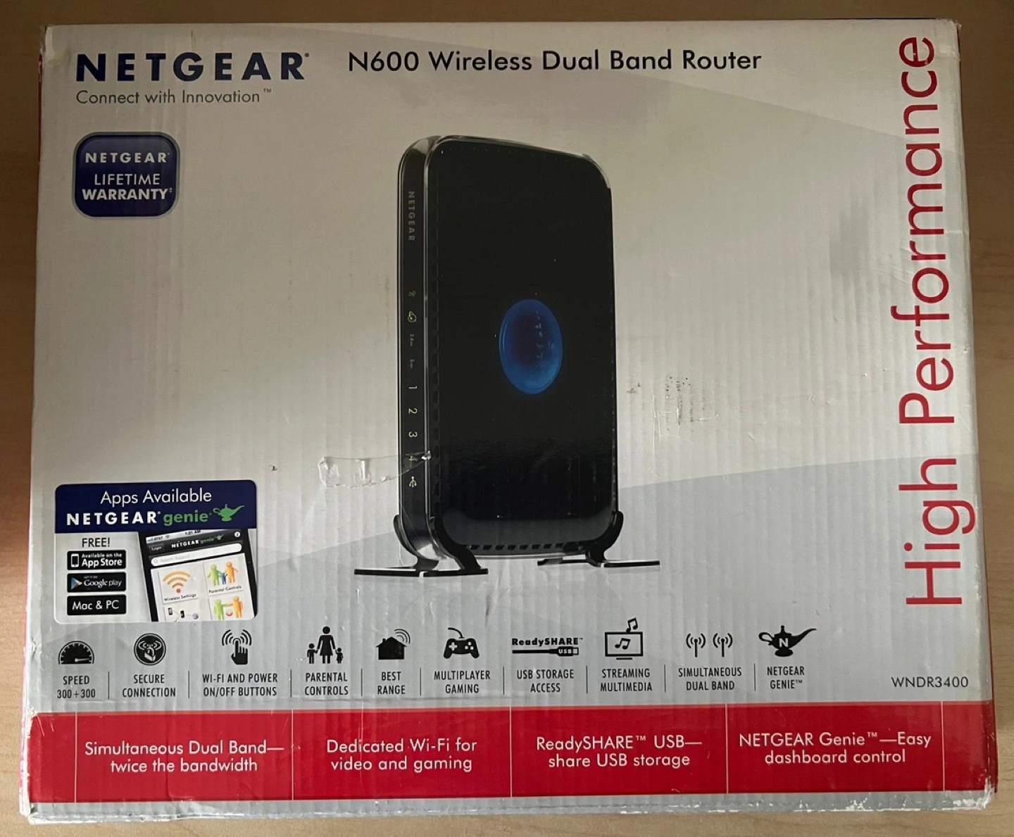 NETGEAR N600 Wireless Dual Band Router (WNDR3400) in excellent condition! Ideal for HD streaming, gaming, and multiple device connections without lag. ✅ Speed: Up to 300 + 300 Mbps ✅ Simultaneous Dual Band: Reduces interference & boosts performance ✅ ReadySHARE USB: Share USB storage across your network ✅ Parental Controls & Guest Network Access ✅ Easy setup with the NETGEAR Genie app