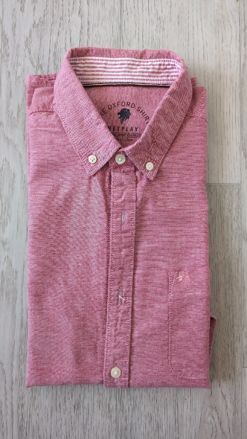 Here's a Netplay Oxford shirt in size 42. It's a nice red/pink colour with an acid wash style and looks great! Perfect for a casual or semi-formal occasion. It's in great condition.