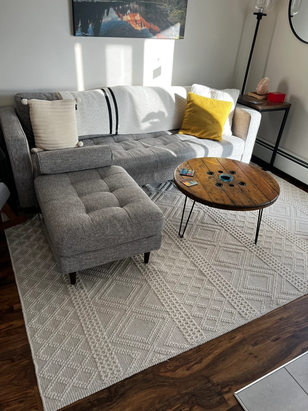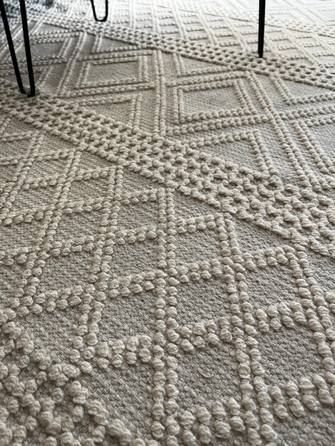 Selling a neutral-coloured area rug with a lovely geometric pattern. It's in great condition and would look fantastic in any living room or bedroom. It's a great way to add some texture and warmth to your space! Originally from Urban Barn