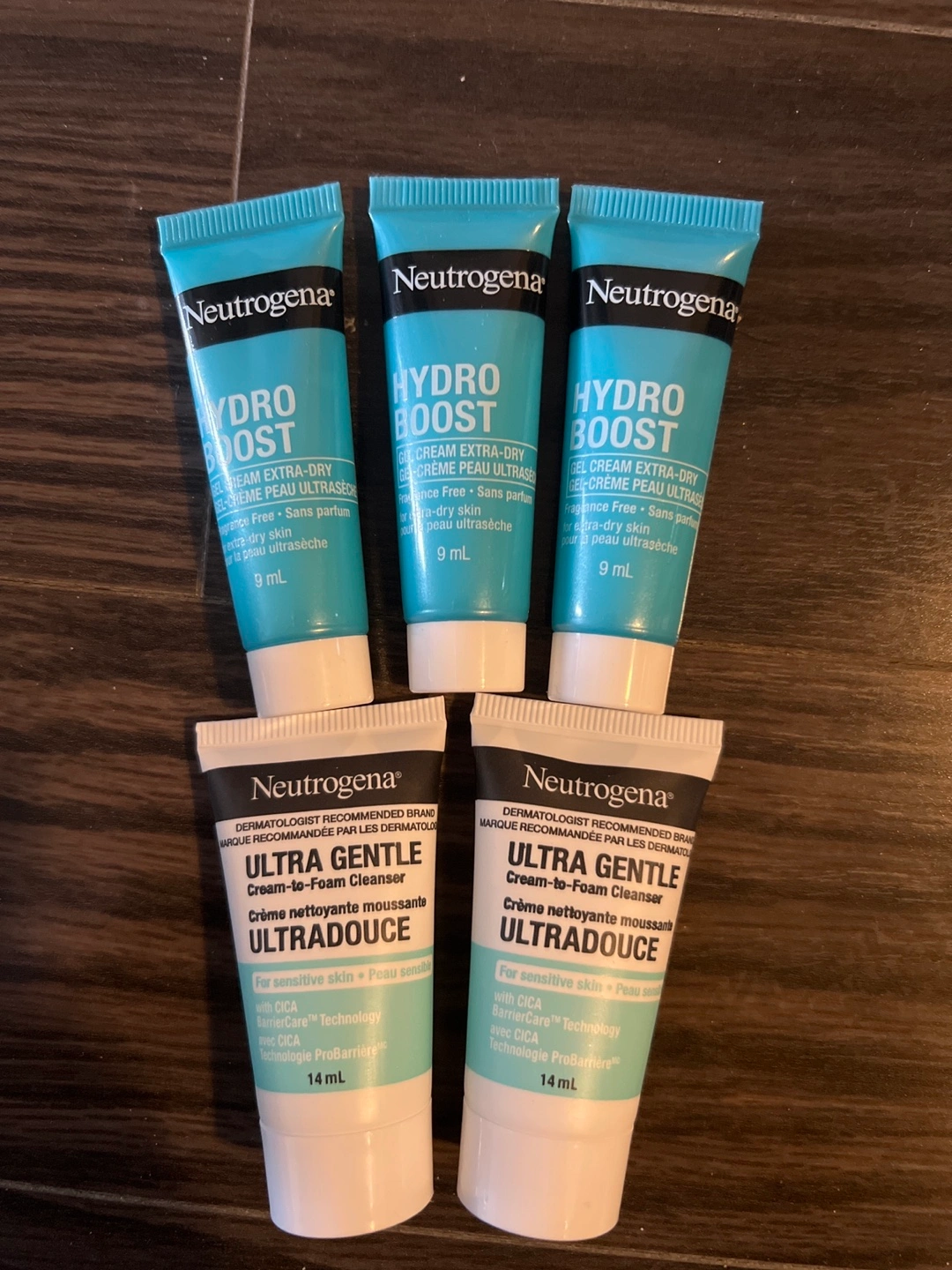 Five travel-sized skincare samples. Three Hydro Boost gel-creams for extra-dry skin and two Ultra Gentle cream-to-foam cleansers for sensitive skin. Fragrance-free.