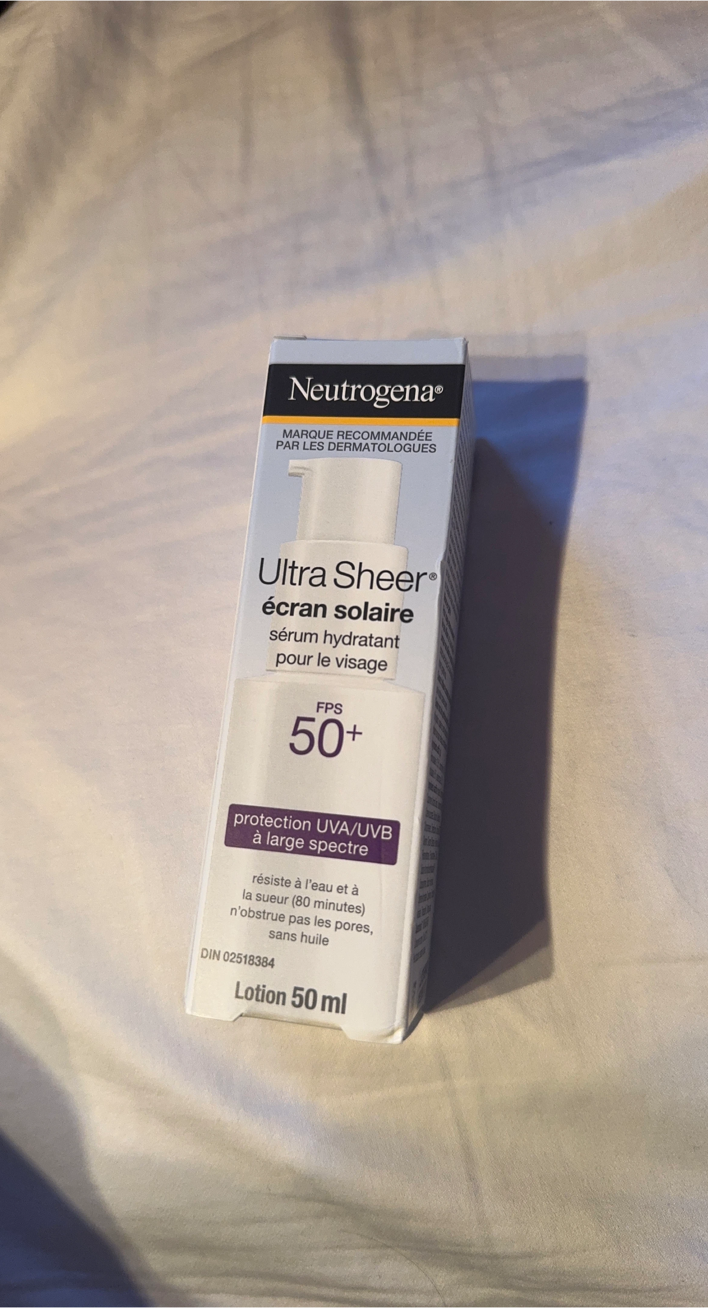Selling a brand new Neutrogena Ultra Sheer sunscreen lotion with SPF 50+! This lotion provides UVA/UVB protection and is water and sweat resistant for up to 80 minutes. It's also non-comedogenic, so it won't clog your pores. Perfect for daily use!