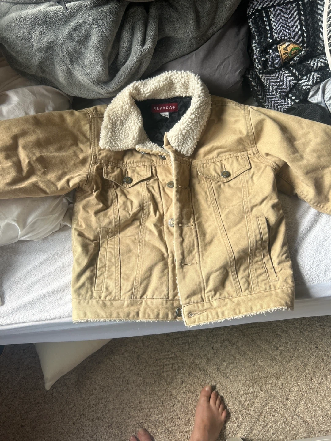 Selling a gently used Nevada denim jacket for kids! It's a size 12 (M/M(10-12)). The jacket features a cozy sherpa collar and a classic denim look. Perfect for keeping your little one warm and stylish!