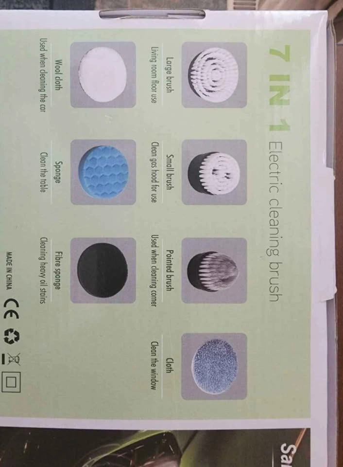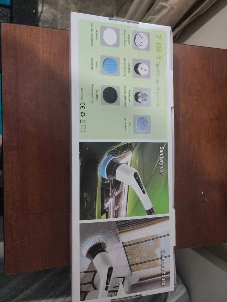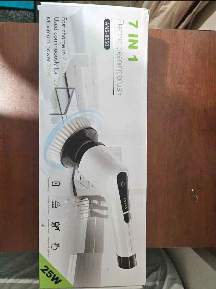 I'm selling a brand new 7-in-1 electric cleaning brush with a 25W maximum power. It charges quickly in 2 hours and can be used continuously for 120 minutes. This versatile tool is perfect for various cleaning tasks around the house or in your car.