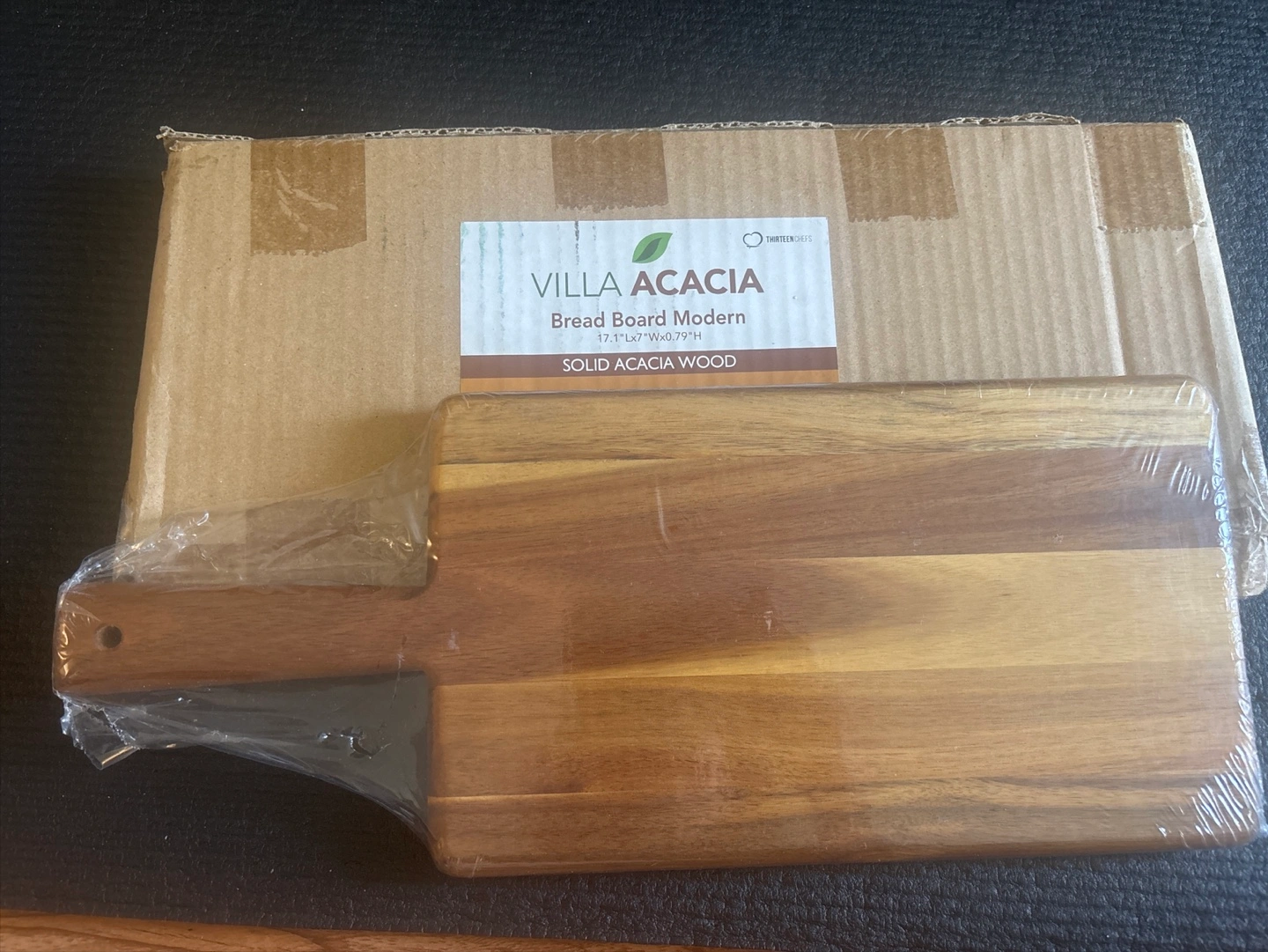 I'm selling a brand new Villa Acacia Bread Board! (I need a big cutting board ๐ญ) This modern bread board is made of solid acacia wood, which is beautiful, natural, durable, and resists water and rot. It's also lined and reinforced. The dimensions are 17.1" L x 7" W x 0.79" H