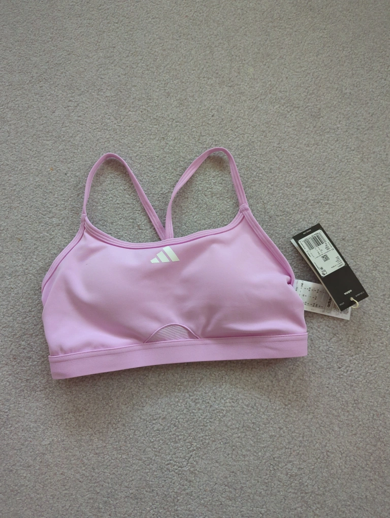 This is a brand new with tags Adidas AEROREADY light support sports bra in size small. It's a beautiful light purple colour and features the Adidas logo. Perfect for low-impact workouts or everyday wear!