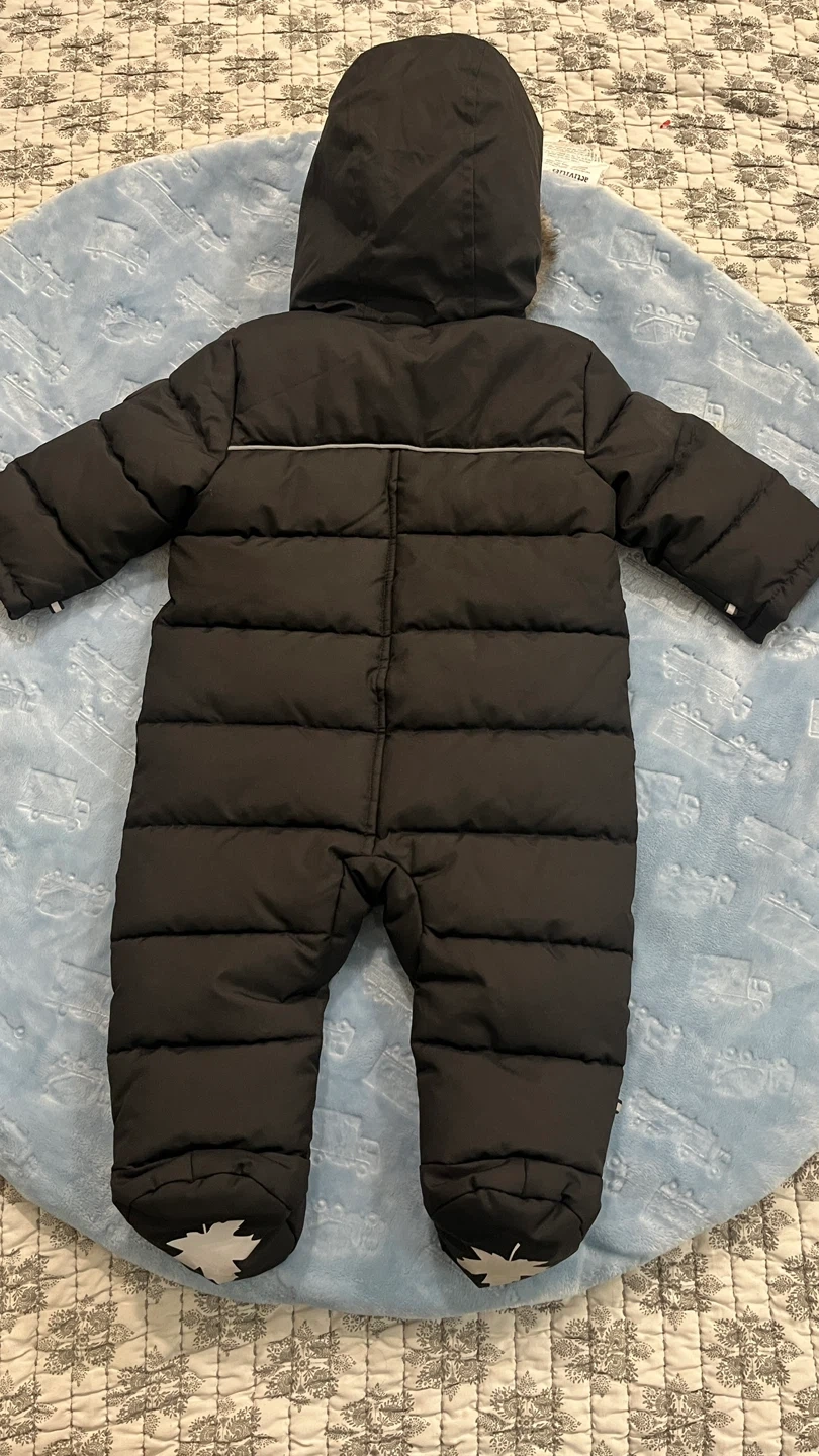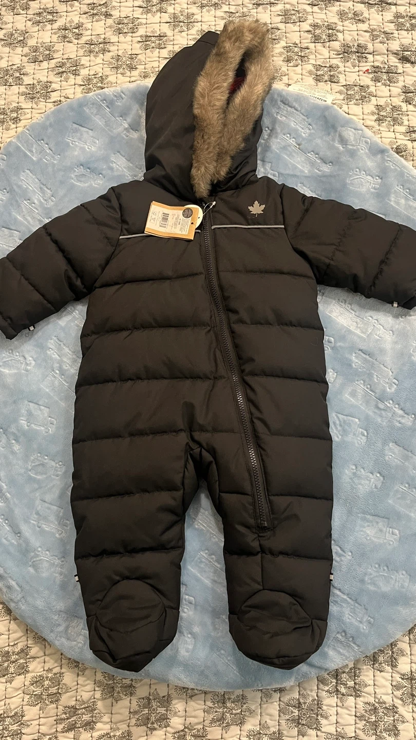 This Adventure one-piece snowsuit is brand new with tags still attached! It's a cozy and warm option for keeping your little one snug during winter adventures. The snowsuit features a full zipper for easy dressing and a faux fur-trimmed hood for extra warmth. It also has a cute maple leaf detail on the chest and a reflective stripe for added visibility