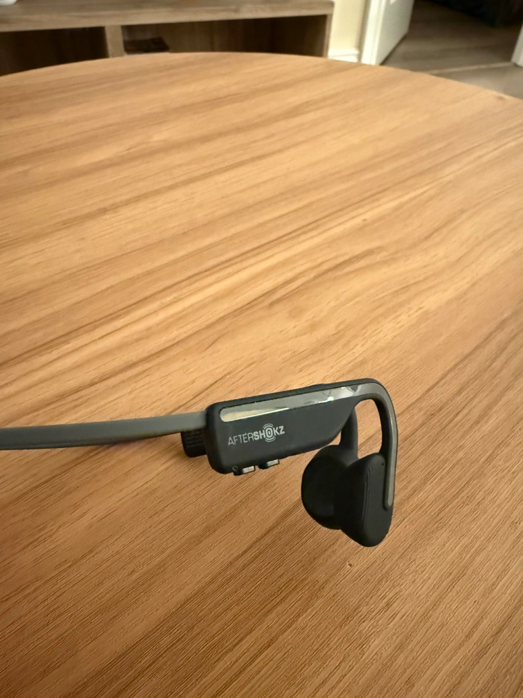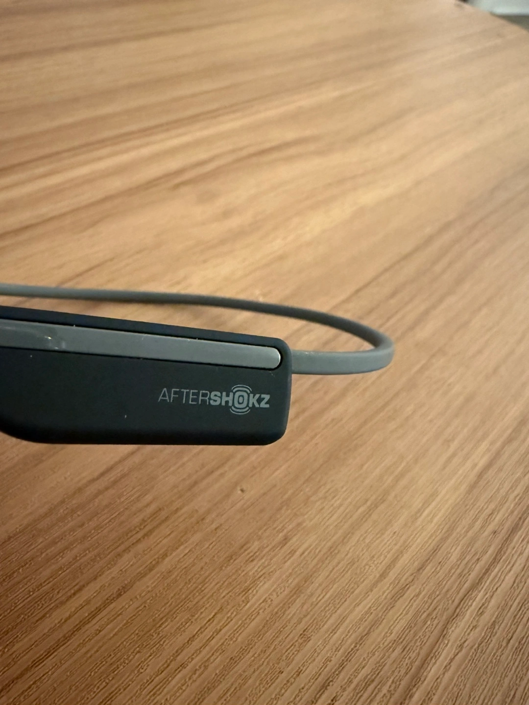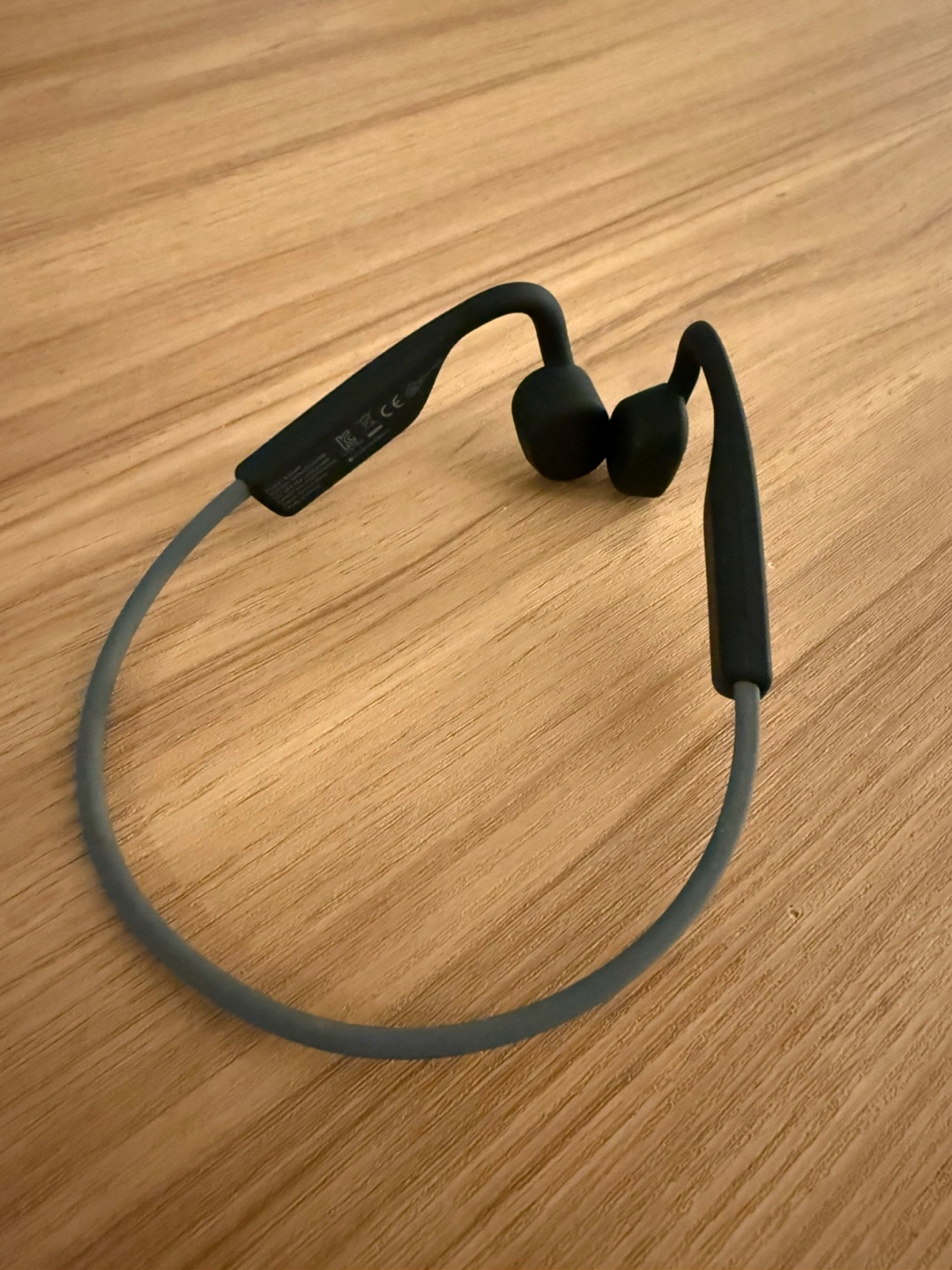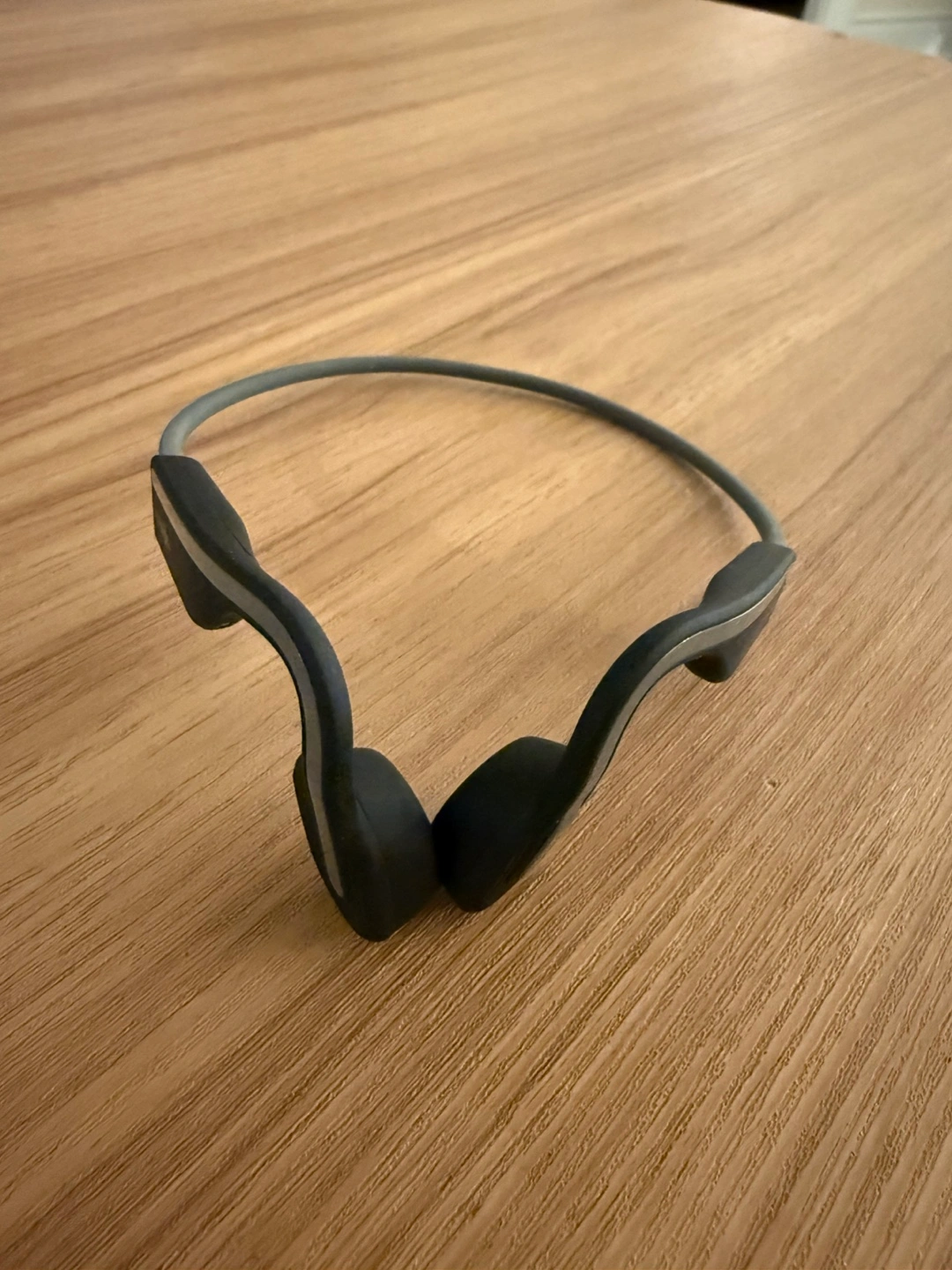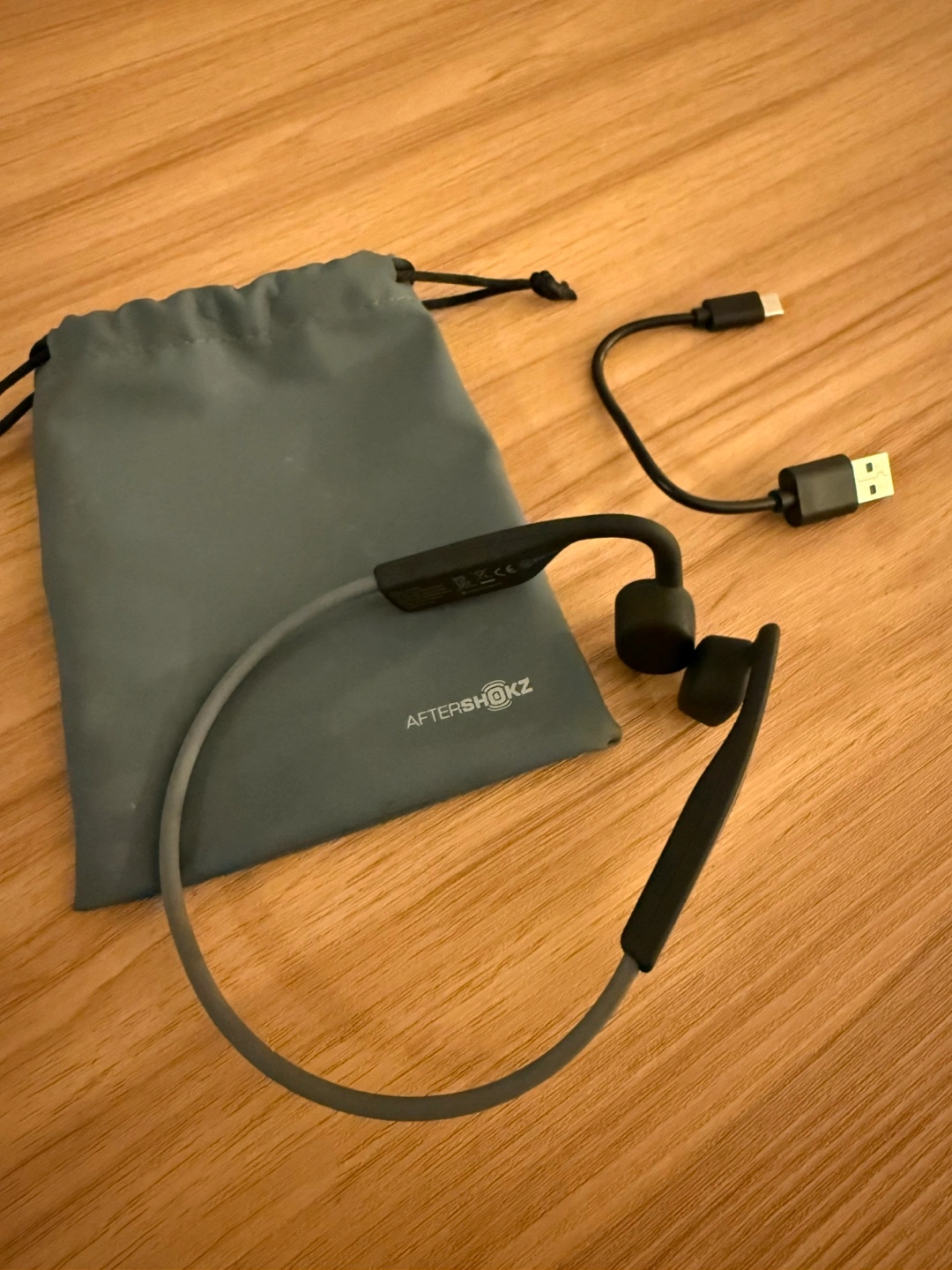 Wireless bone conduction headphones. Includes charging cable and carrying case. Grey and black. Amazon price: $206+tax Gift, never used.