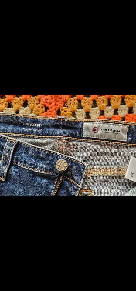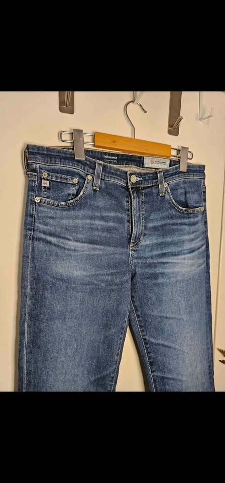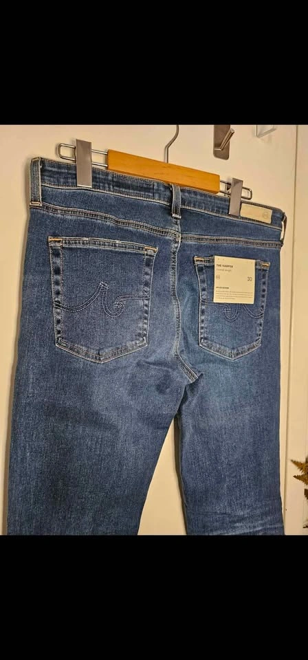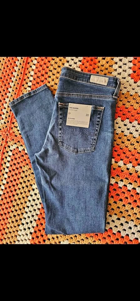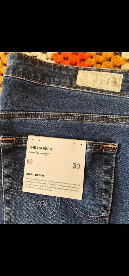 Brand new with tags, The Harper Essential straight leg jeans from AG Adriano Goldschmied's premium AG-ed vintage-inspired line. These jeans are mid-rise and feature faux fading for a broken-in look. Classic 5 pocket design, and a zipper fly, with antiqued silver tone hardware. Jeans are a medium blue wash, and have an off-white leather waist tag. Jeans are a size 30R and are in new condition. Waist measures about 16", front rise measures about 9.5", and inseam measures about 32". Retail value $400. Made of 98% cotton and 2% polyurethane for stretch and comfort. luxury denim classic staple minimalist