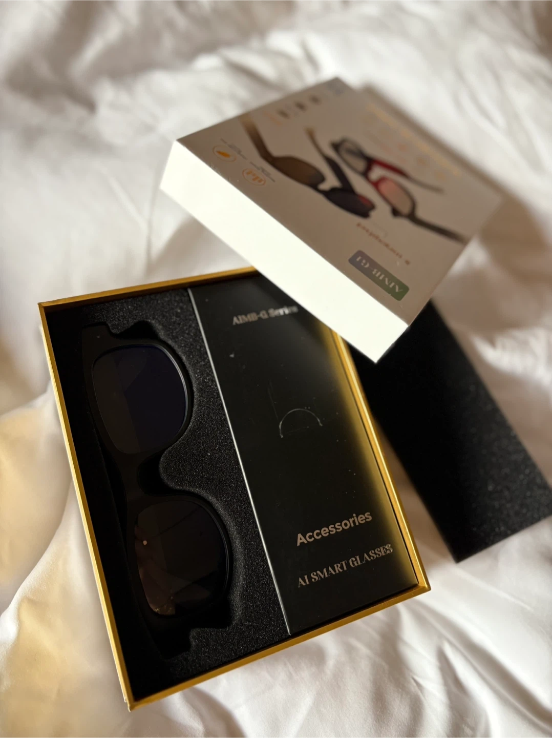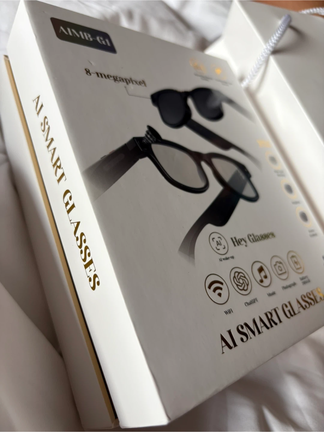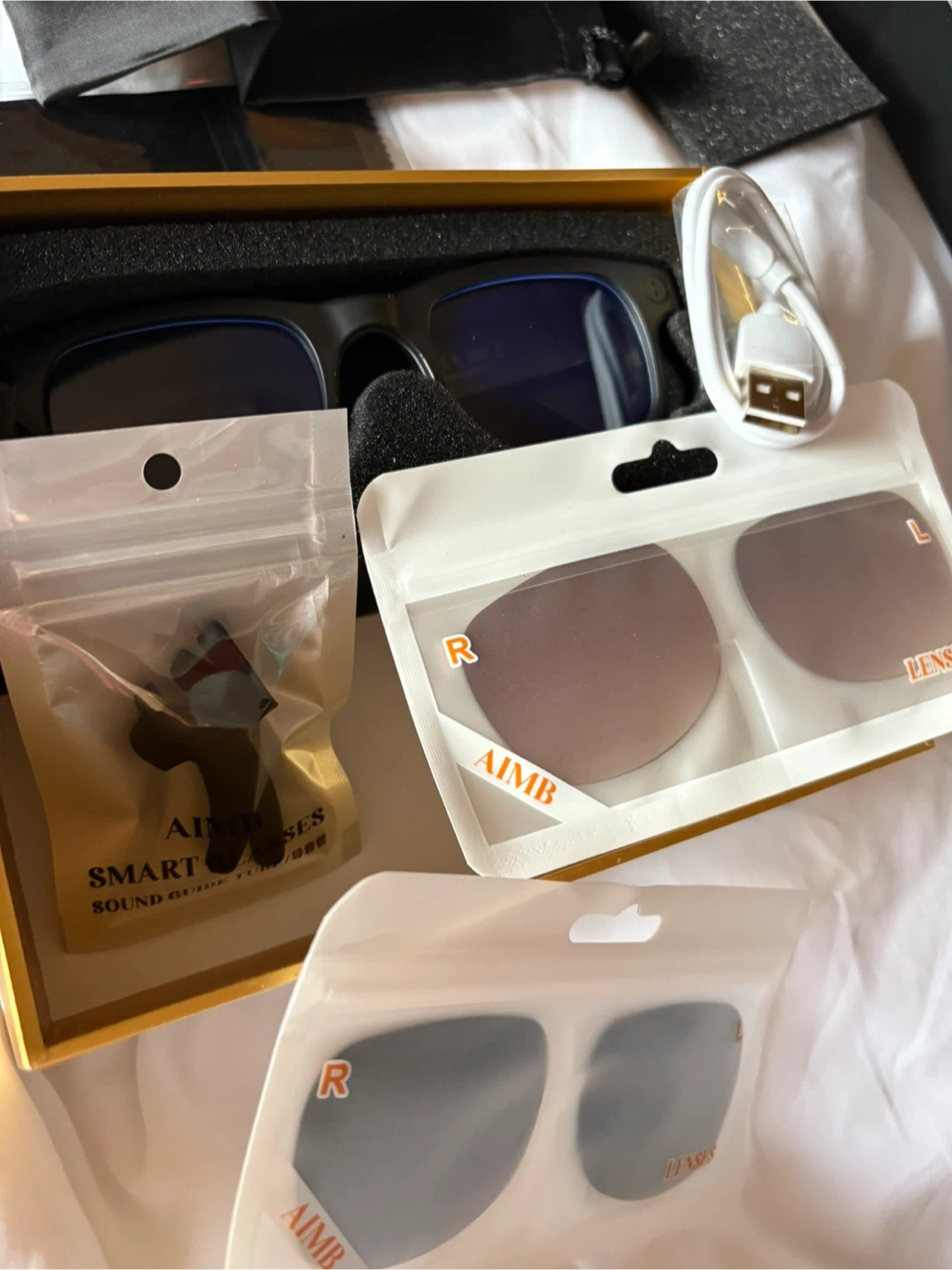 Selling a brand new set of AIMB-G1 AI Smart Glasses! They come with all the original accessories and packaging. These glasses feature an 8-megapixel camera and support WiFi, ChatGPT, music playback, and photography. They also include extra lenses and a charging cable, all in the original box