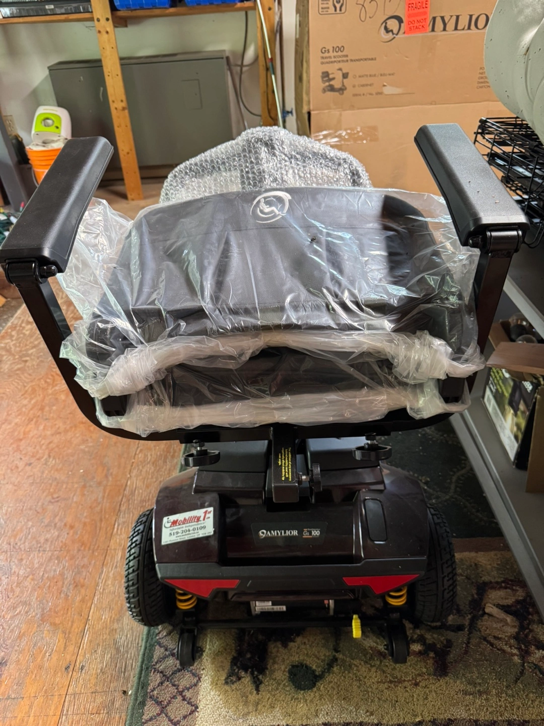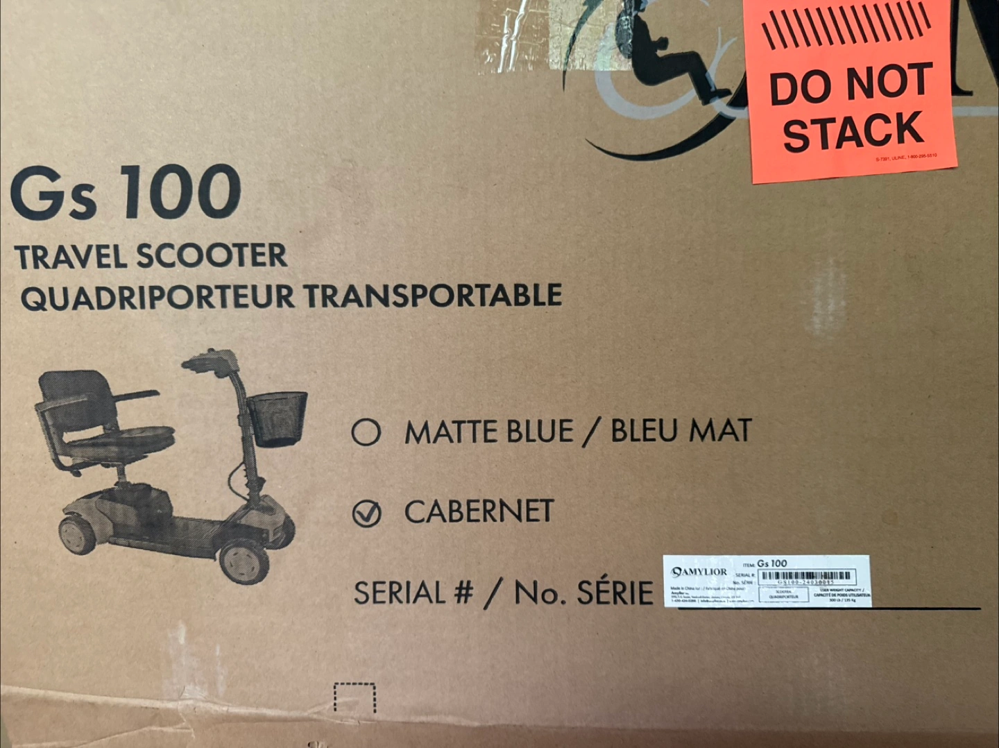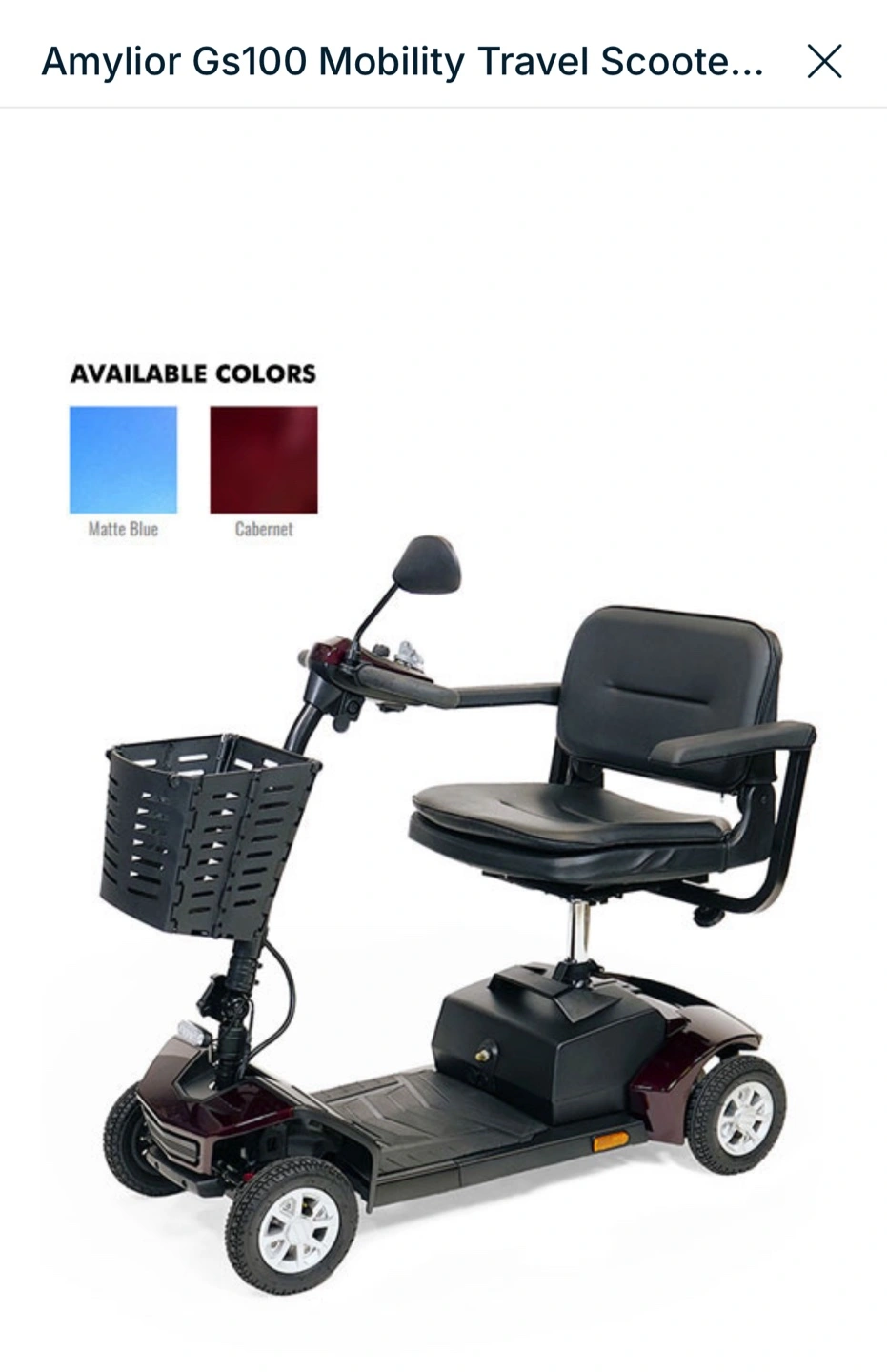 I'm selling a brand new Amylior Gs100 Mobility Travel Scooter in Cabernet colour! It comes in its original box. Perfect for getting around with ease and comfort Description from website: The Amylior compact travel scooter offers effortless maneuverability and transportability. Explore its key features: Sealed Lead-Acid Batteries (22Ah): The scooter comes with two sealed lead-acid batteries with a capacity of 22Ah each. These batteries provide the power needed to operate the scooter and allow for local trips or travel. Quick Release Collapse: The scooter features a quick-release mechanism that allows for easy collapsing and disassembly. This is particularly useful when you need to transport the scooter in a car or store it in a compact space. LED Front Light: The scooter is equipped with an LED front light, enhancing visibility during low-light conditions or nighttime use, ensuring safer travel. Foldable Removable Basket: A foldable and removable basket is included, providing convenient storage space for personal items or shopping bags while using the scooter. Control Panel with Charge Indicator: The control panel on the scooter includes a charge indicator, allowing you to monitor the battery level and plan your trips accordingly. Adjustable Tiller: The tiller, which is the steering column of the scooter, is adjustable. This allows you to customize the steering position for your comfort and preference. Tires with Inner Tube: The scooter features tires with inner tubes, which can provide a smoother ride and better shock absorption, enhancing overall comfort. Charger Storage Compartment: There's a designated storage compartment for the charger. This helps keep the charging equipment organized and accessible. Rear-View Mirror: The scooter comes with a rear-view mirror to assist you in keeping an eye on traffic and your surroundings while operating the scooter. Four-Wheel Suspension: The inclusion of four-wheel suspension enhances the scooter's ability to handle uneven terrain and bumps, providing a smoother ride experience. Overall, the Gs100 Travel Scooter by Amylior is designed to be a user-friendly and versatile mobility solution, especially for those who need a compact and easily transportable scooter for local trips or travel. It offers a range of features that contribute to its ease of use, comfort, and safety.