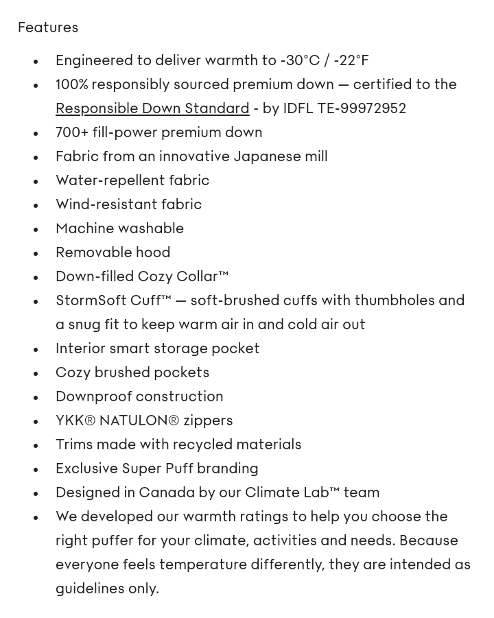 Brand new with tags ARITZIA Super Puff / SuperSnug Puff Size Small Premium down puffer jacket Retails $325 ($367.25 with tax) This puffer is constructed with innovative fabric from Japan and contains 100% responsibly sourced premium down. Engineered to deliver warmth to -30°C / -22°F, this is an hourglass puffer with a slim silhouette that hugs the body. It’s filled with 100% responsibly sourced, 700+ fill-power premium down that provides ultra-warm and lightweight insulation. It’s made with cliMATTE™ — water-repellent and wind-resistant ripstop fabric with a matte finish and a soft feel. This fabric is sourced from a Japanese mill that specializes in performance fabrics.