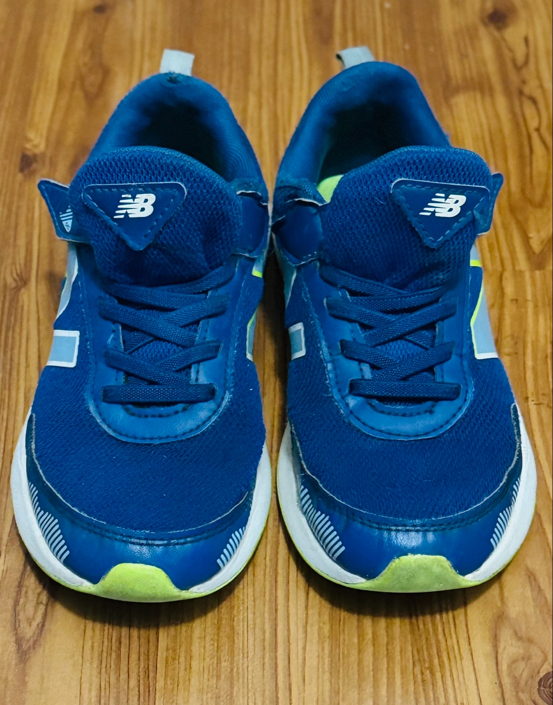 Blue and lime green kids' running shoes. Size 3 US. Velcro and lace closure. Pre-owned, good condition. Only available for pick up