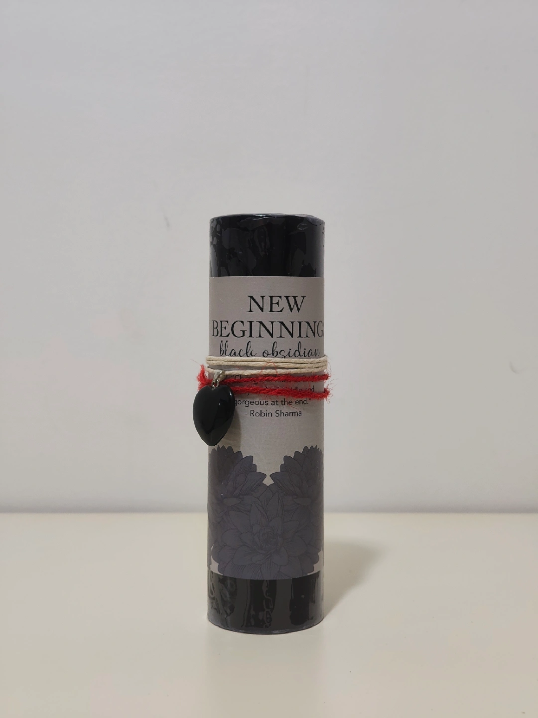 Selling a 'New Beginning' black obsidian candle. It's in great condition and ready to bring a fresh start to your space! Gorgeous at the end day