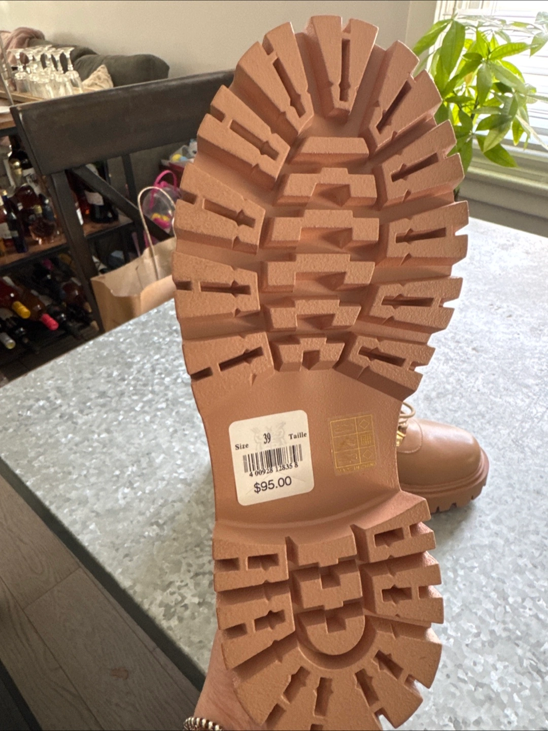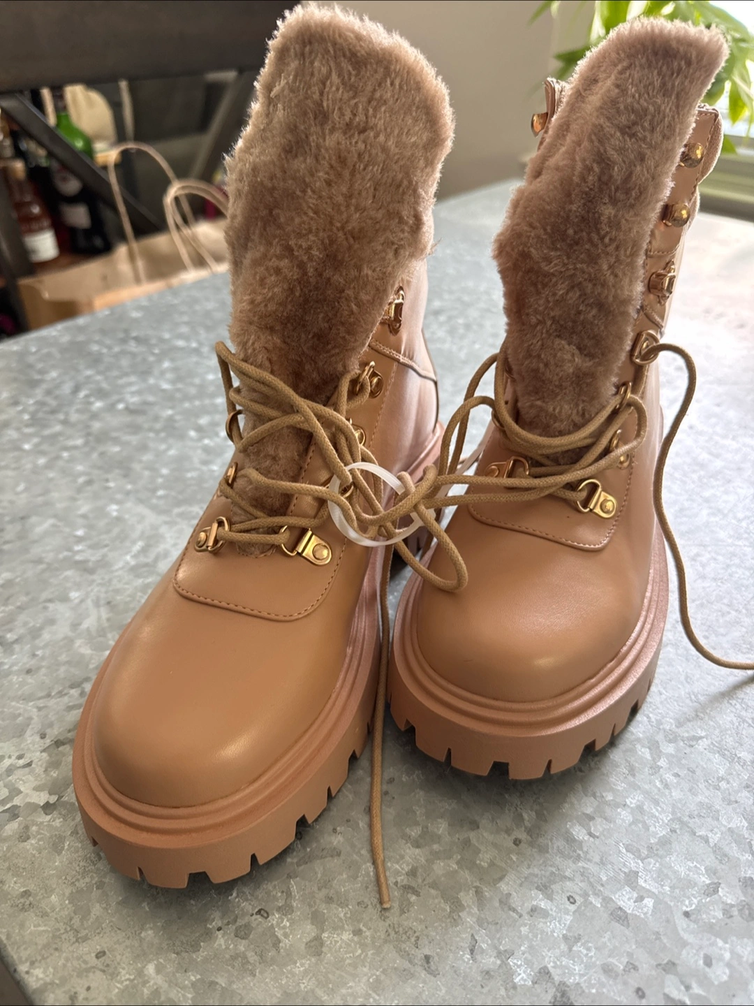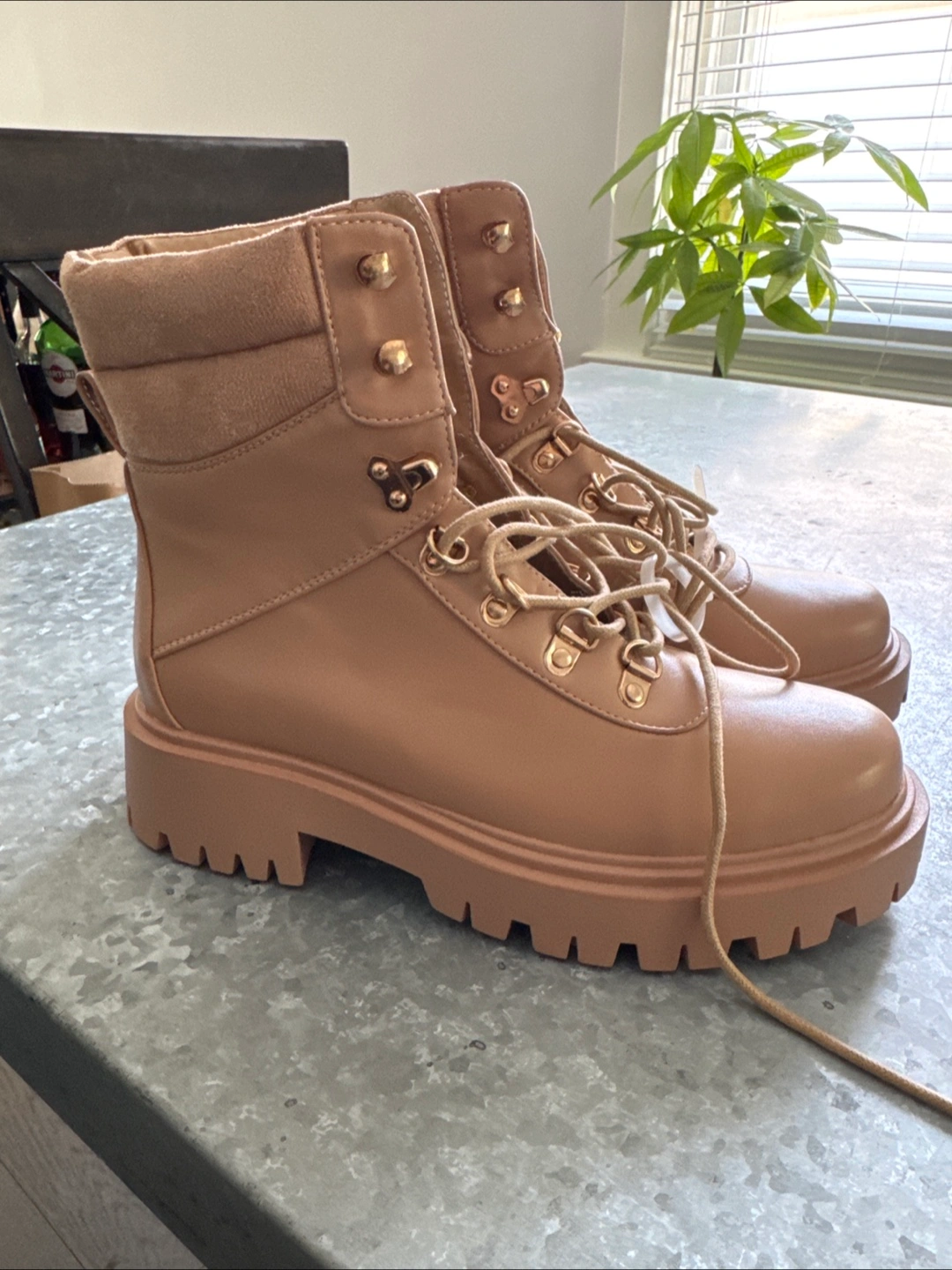 Beige coloured boots. Feature gold coloured eyelets. Thick, rugged soles. Laces attached. Cozy for a relaxing walk outdoors.