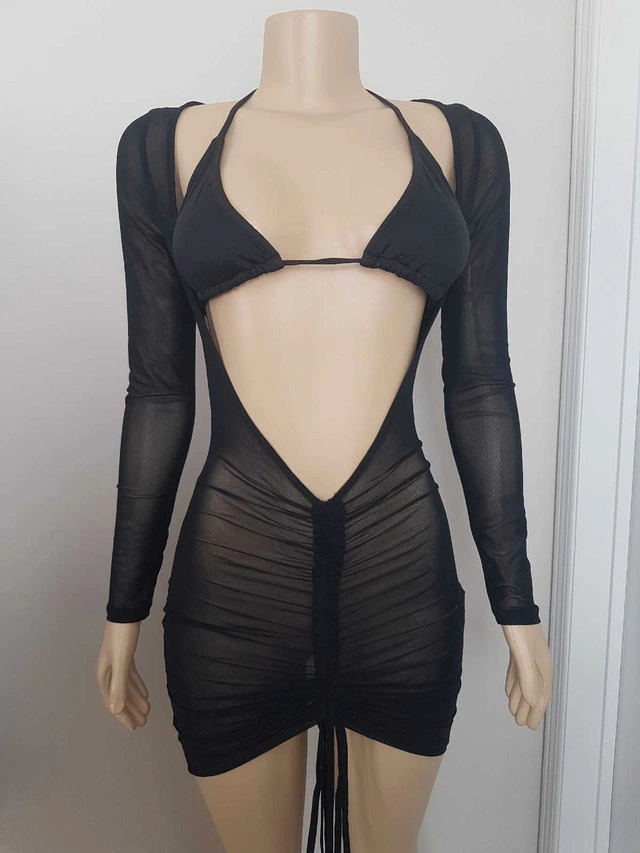 New black ruched mesh cover up dress from Fashion Nova Hasn't been worn, size Small and very stretchy Adjustable length *Bikini not included Located in Aurora