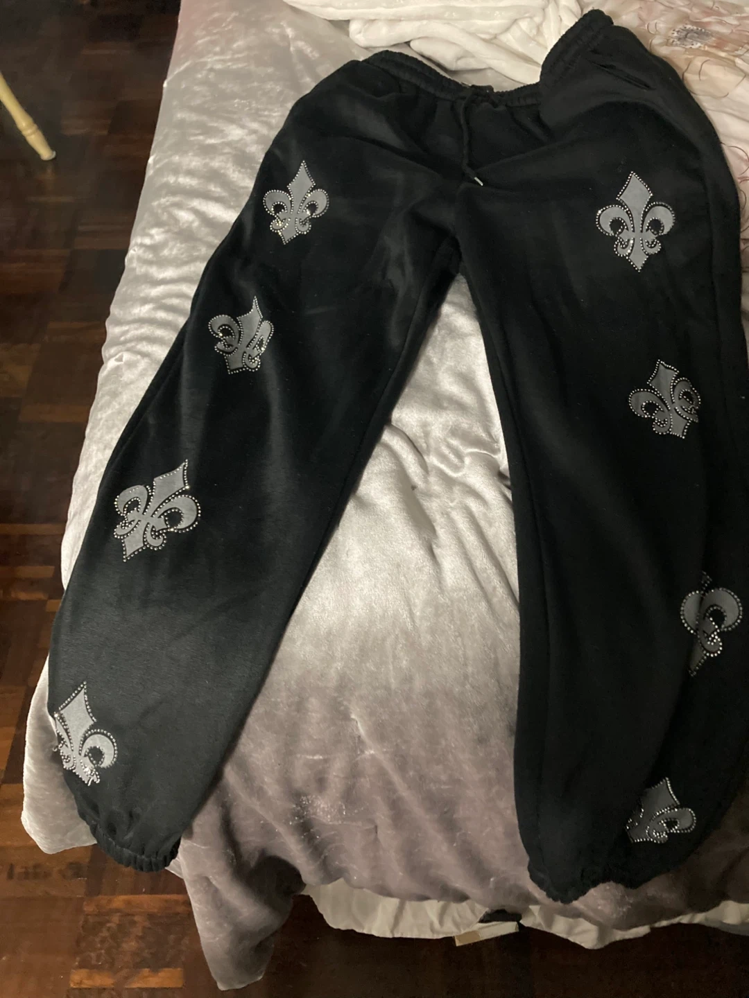 Selling a pair of black sweatpants featuring a design. They're super comfy and stylish for everyday wear! The material is soft and cozy, perfect for lounging around or running errands. They have a relaxed fit and an elastic waistband for extra comfort. Only worn once. Size medium ๐บ