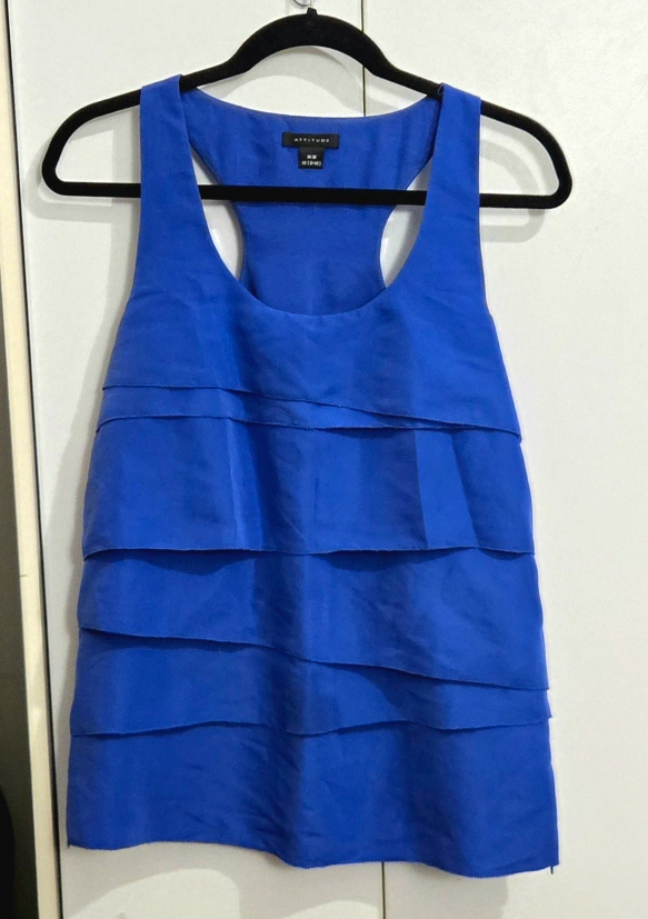 A cute dressy blue sleeveless top from Attitude! It features a stylish ruffle design and is perfect for a night out.