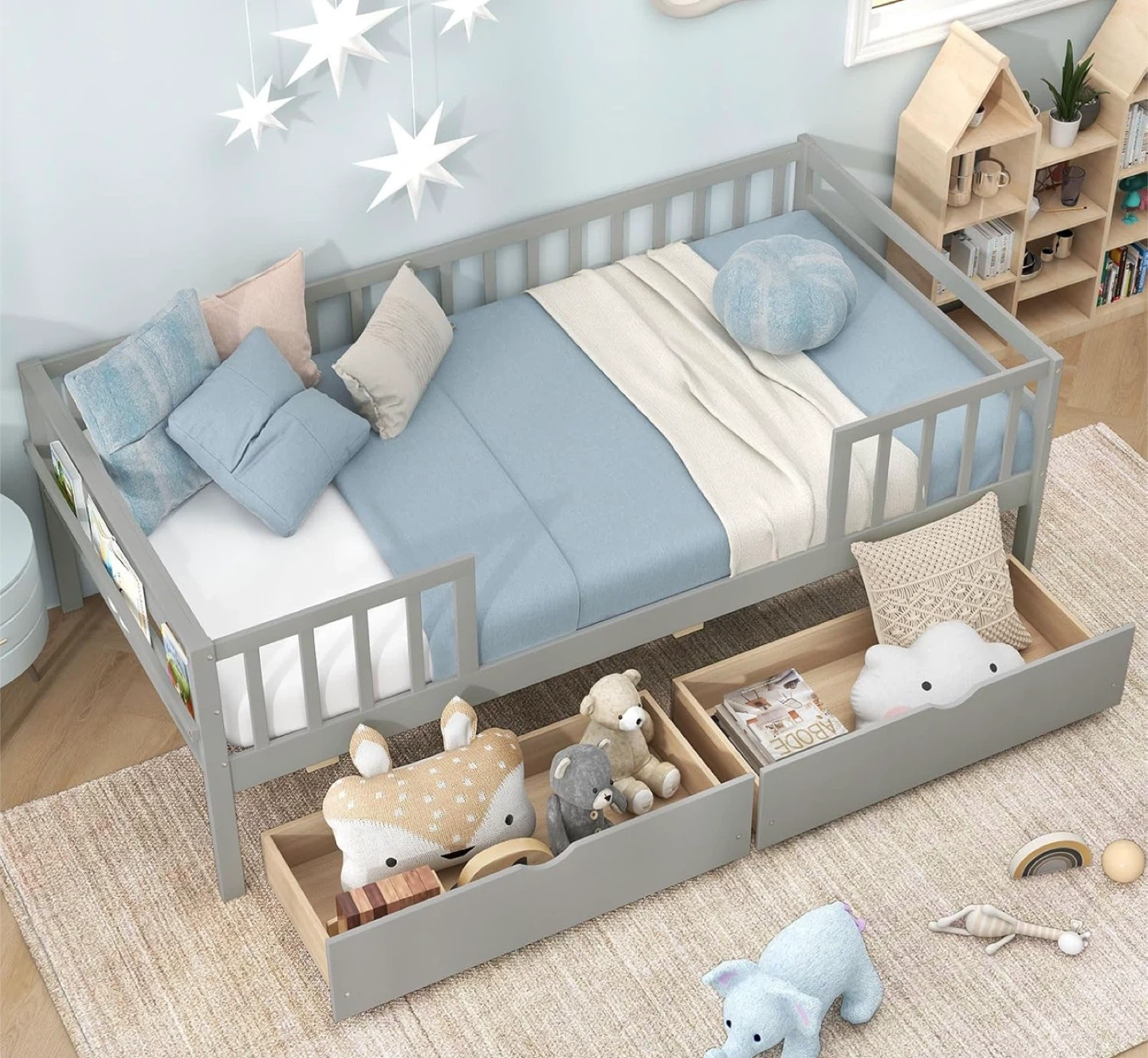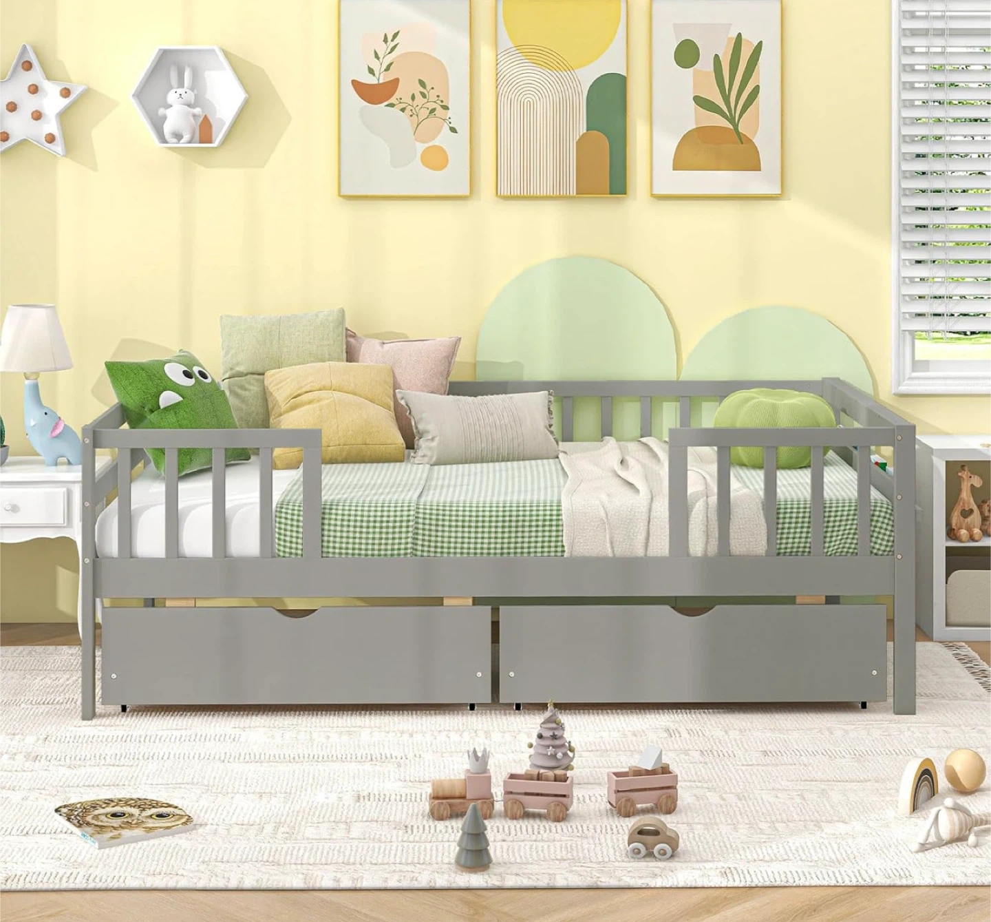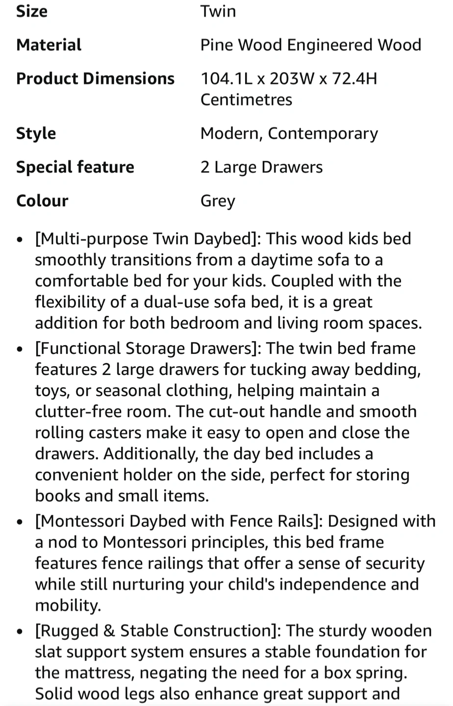 NEW (BNIB) Montessori Style Twin Bed (no mattress). Details and dimensions below and in photos. Retail price $ 289.99 on Amazon (see last photo). Pick up only near Bermondsey & O’Connor. Size Twin Material Pine Wood Engineered Wood Product Dimensions 104.1L x 203W x 72.4H Centimetres Style Modern, Contemporary Special feature 2 Large Drawers Colour Grey [Multi-purpose Twin Daybed]: This wood kids bed smoothly transitions from a daytime sofa to a comfortable bed for your kids. Coupled with the flexibility of a dual-use sofa bed, it is a great addition for both bedroom and living room spaces. [Functional Storage Drawers]: The twin bed frame features 2 large drawers for tucking away bedding, toys, or seasonal clothing, helping maintain a clutter-free room. The cut-out handle and smooth rolling casters make it easy to open and close the drawers. Additionally, the day bed includes a convenient holder on the side, perfect for storing books and small items. [Montessori Daybed with Fence Rails]: Designed with a nod to Montessori principles, this bed frame features fence railings that offer a sense of security while still nurturing your child's independence and mobility. [Rugged & Stable Construction]: The sturdy wooden slat support system ensures a stable foundation