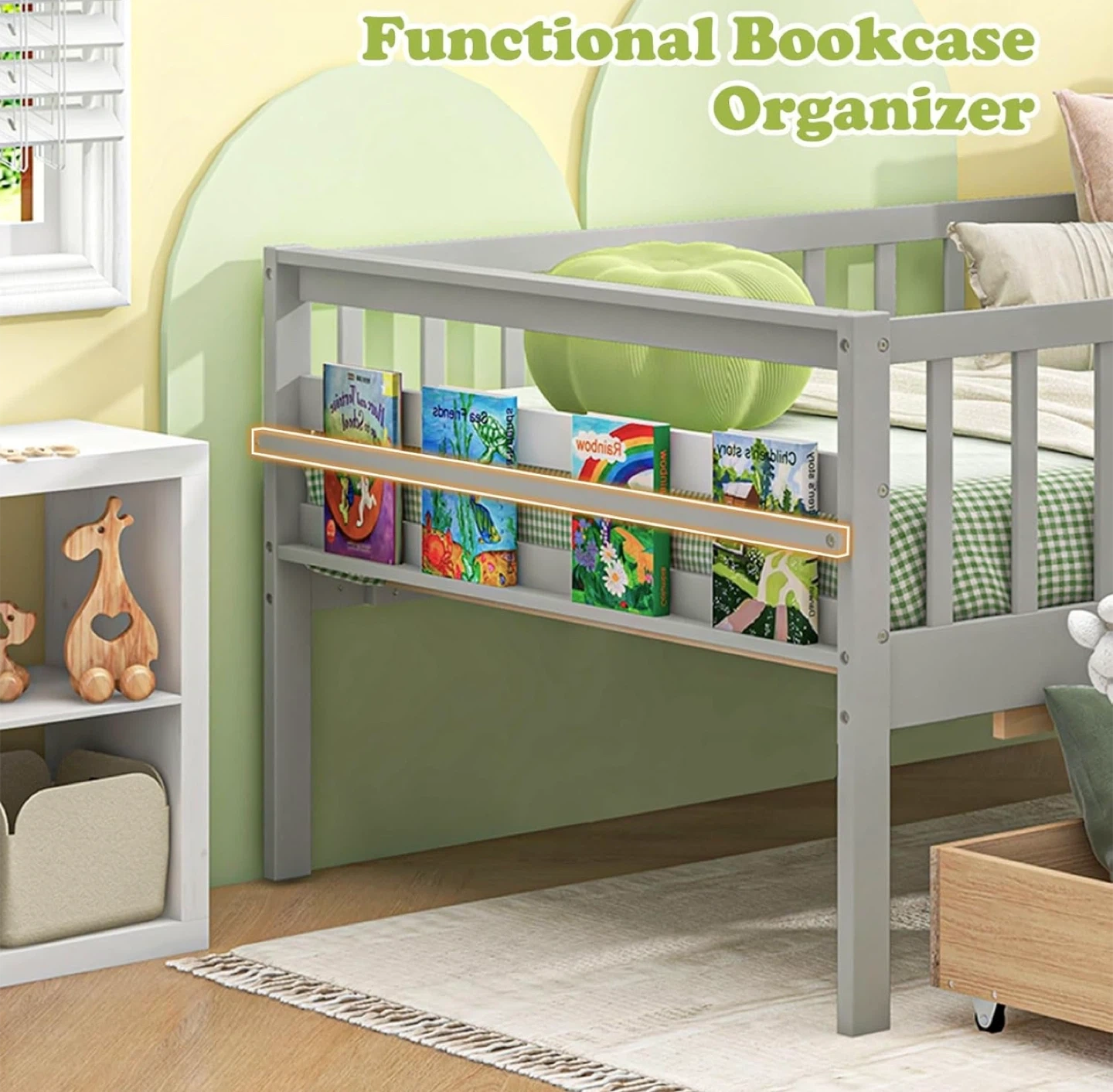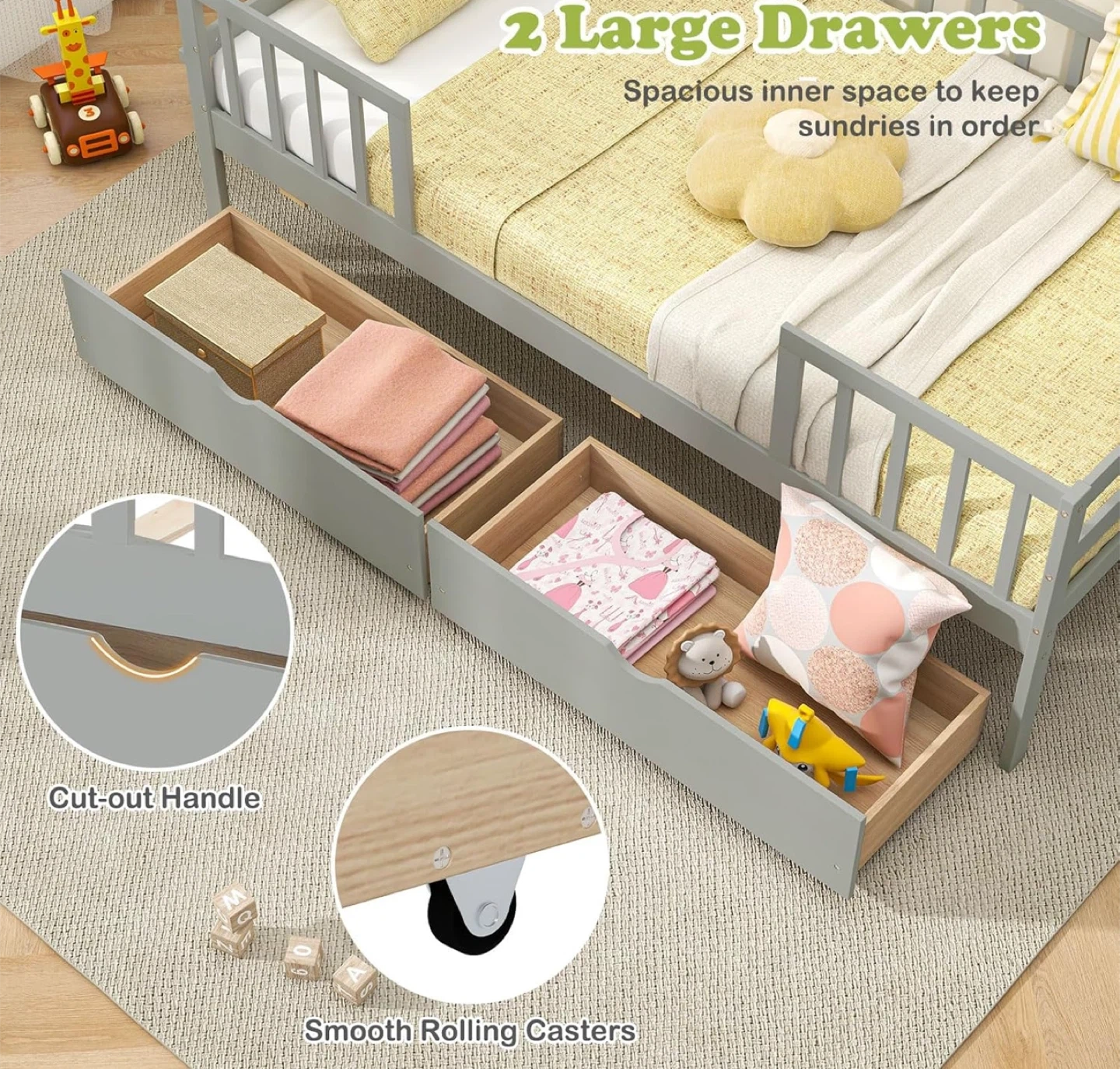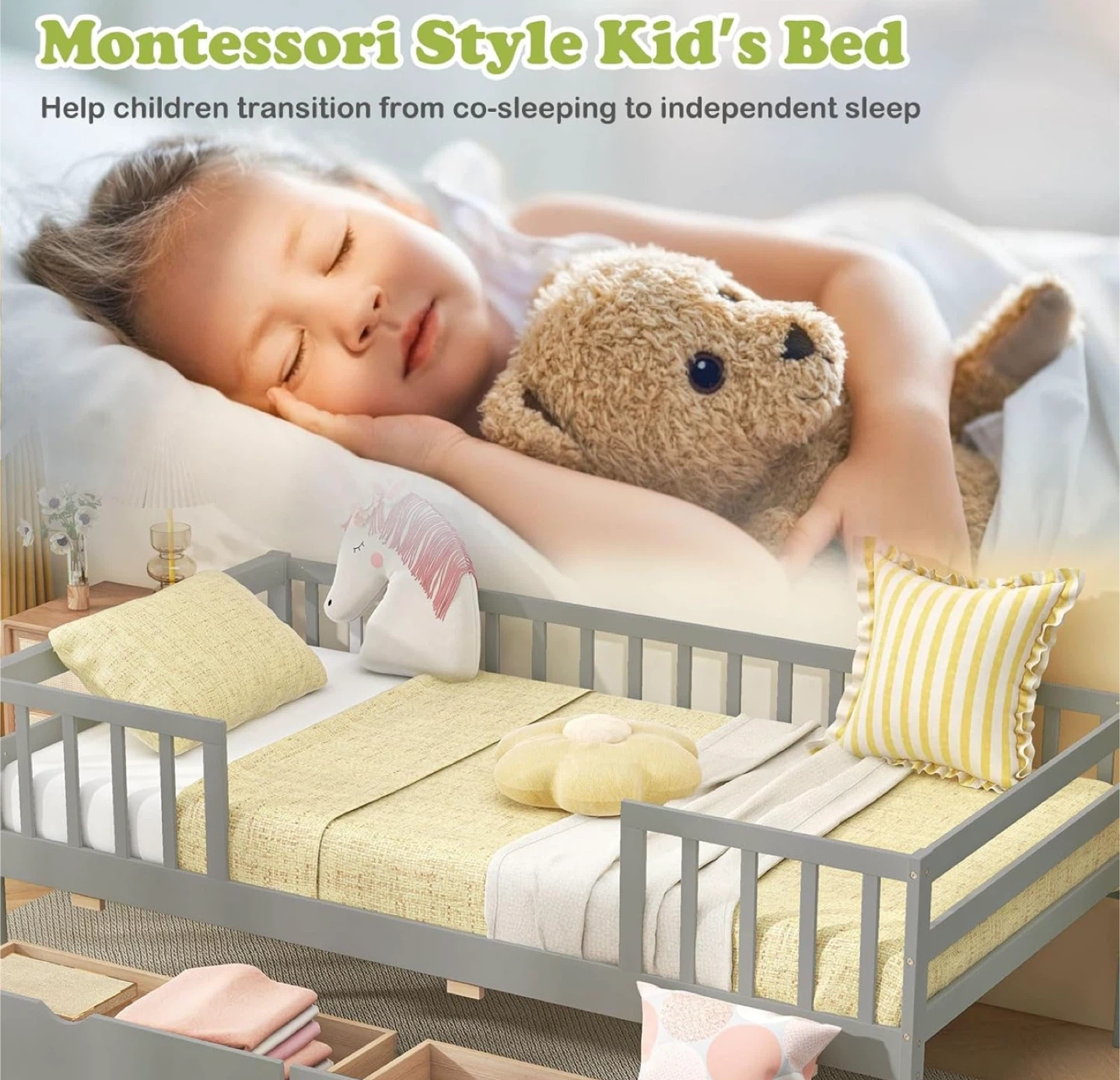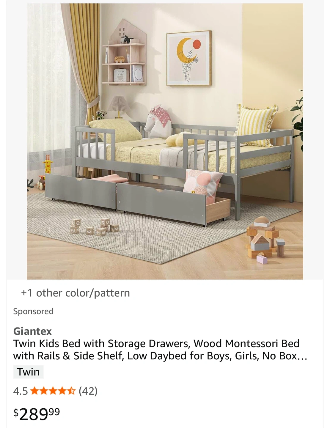 NEW (BNIB) Montessori Style Twin Bed (no mattress). Details and dimensions below and in photos. Retail price $ 289.99 on Amazon (see last photo). Pick up only near Bermondsey & O’Connor. Size Twin Material Pine Wood Engineered Wood Product Dimensions 104.1L x 203W x 72.4H Centimetres Style Modern, Contemporary Special feature 2 Large Drawers Colour Grey [Multi-purpose Twin Daybed]: This wood kids bed smoothly transitions from a daytime sofa to a comfortable bed for your kids. Coupled with the flexibility of a dual-use sofa bed, it is a great addition for both bedroom and living room spaces. [Functional Storage Drawers]: The twin bed frame features 2 large drawers for tucking away bedding, toys, or seasonal clothing, helping maintain a clutter-free room. The cut-out handle and smooth rolling casters make it easy to open and close the drawers. Additionally, the day bed includes a convenient holder on the side, perfect for storing books and small items. [Montessori Daybed with Fence Rails]: Designed with a nod to Montessori principles, this bed frame features fence railings that offer a sense of security while still nurturing your child's independence and mobility. [Rugged & Stable Construction]: The sturdy wooden slat support system ensures a stable foundation