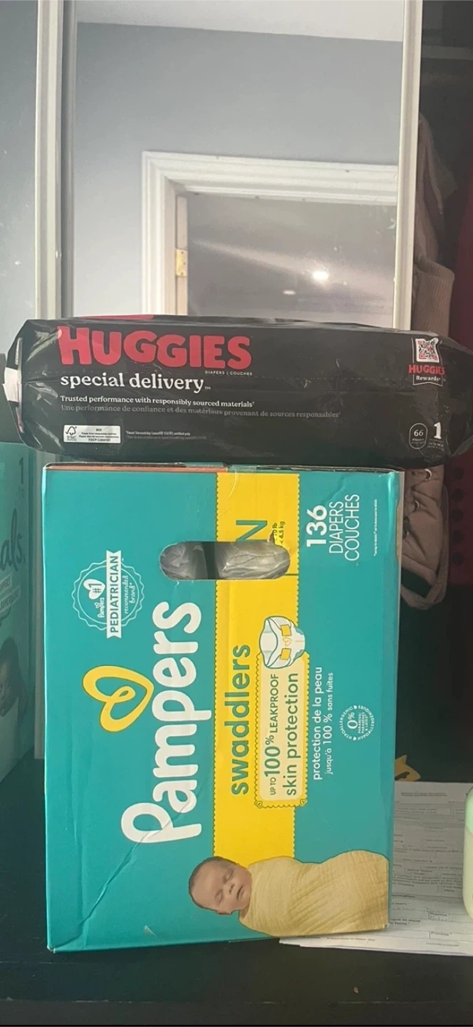 New unused box/packet of Pampers new born and Huggies size 1 pampers.