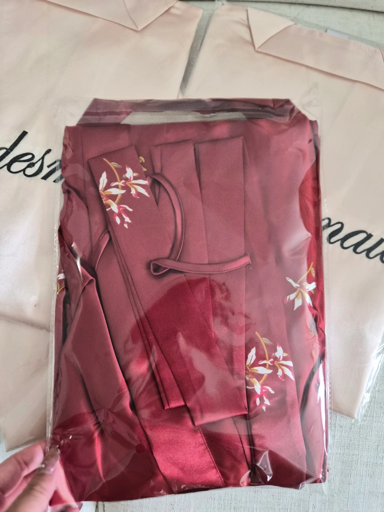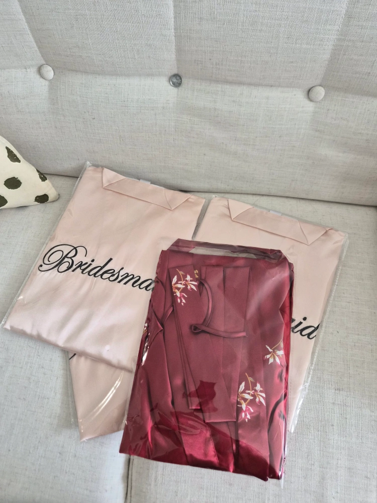 I have new bridesmaid robes for sale! There are blush-coloured robes with 'Bridesmaid' embroidered on them, and a burgundy robe with a floral design. bride robe size L bridesmaid size M