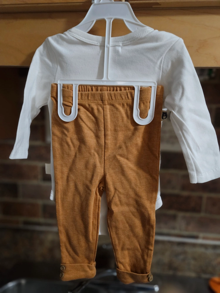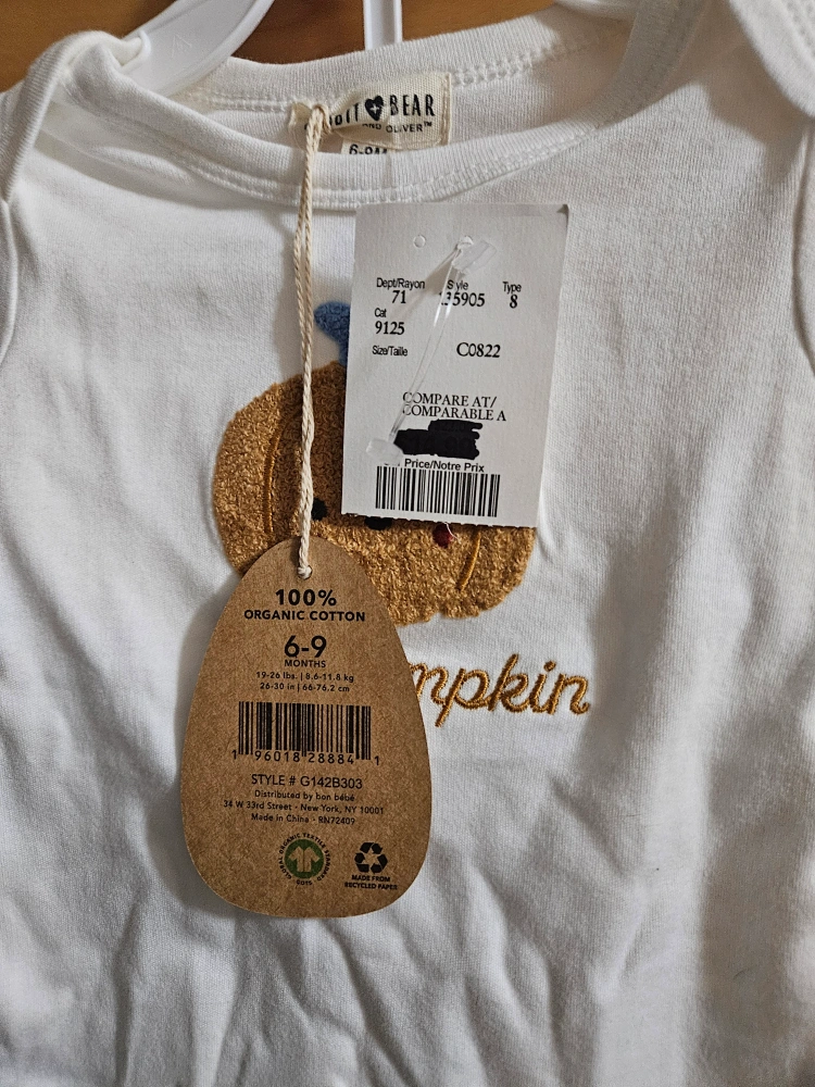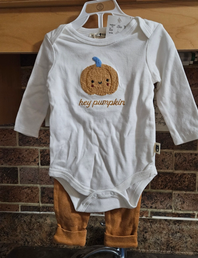 This adorable Burt's Bees Baby outfit is brand new with tags! The set includes a long-sleeve bodysuit with a cute pumpkin design and matching pants. It's made from 100% organic cotton and is perfect for babies aged 6-9 months (19-26 inches / 11.5-16.5 lbs).