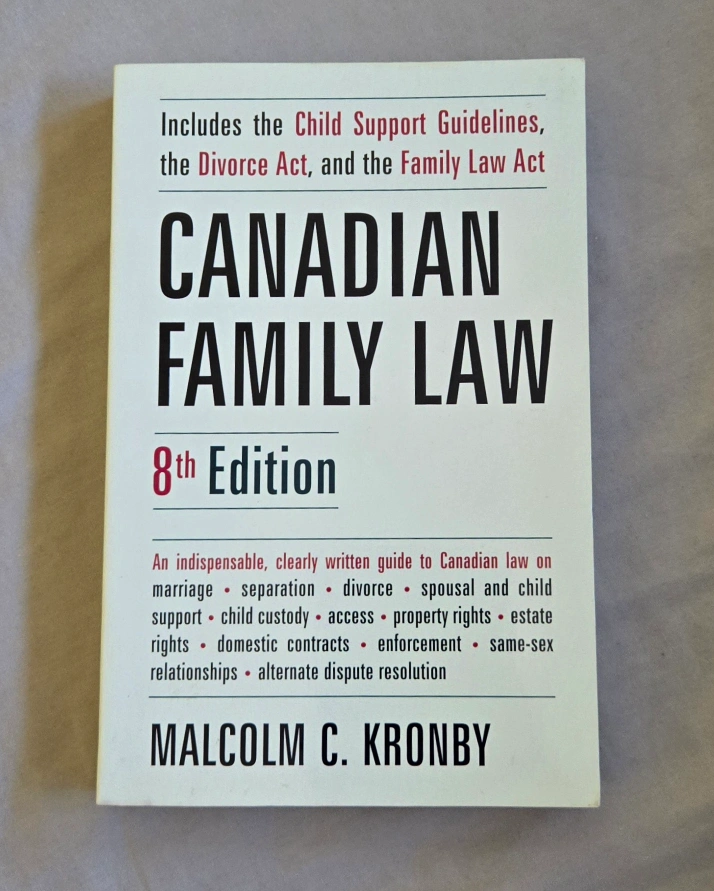 Selling a copy of Canadian Family Law, 8th Edition, by Malcolm C. Kronby. It includes the Child Support Guidelines, the Divorce Act, and the Family Law Act. A fully revised and updated edition of this national bestseller!