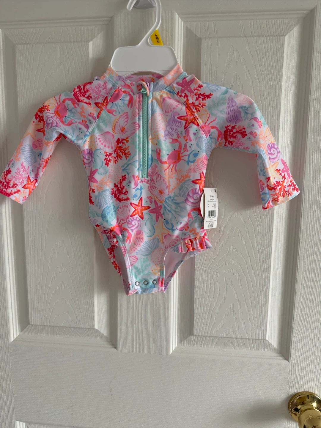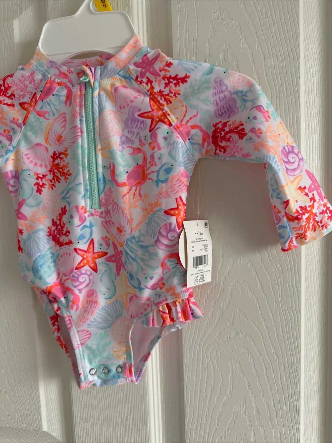 This adorable Carter's swimsuit is brand new with tags! It's a size 12-18 months and features a fun, colourful sea-themed pattern. Perfect for your little one's summer adventures!