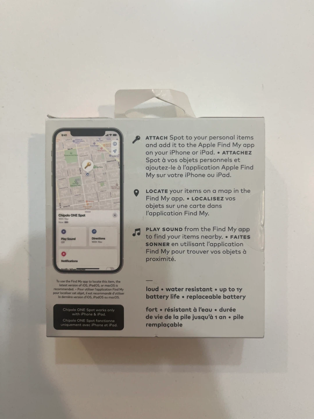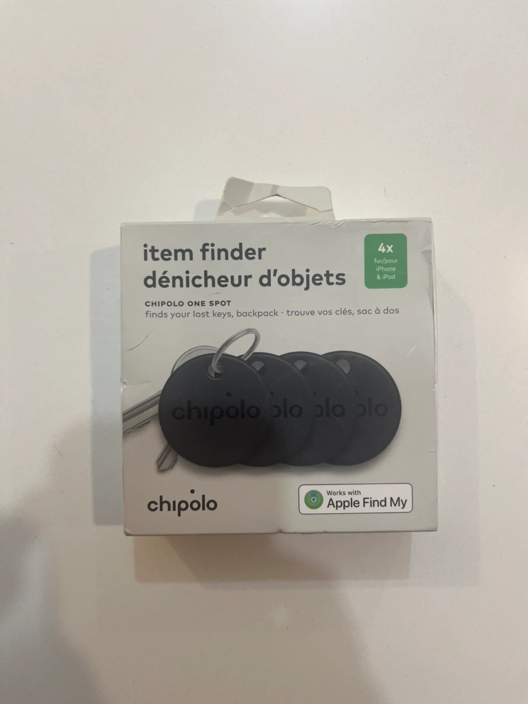 I'm selling a brand new Chipolo ONE Spot item finder, still in its original packaging! This is a 4-pack. Key features: - Works with Apple Find My - Loud sound - Water resistant - Up to 1 year battery life with a replaceable battery Attach Spot to your personal items and easily locate them on a map using the Find My app