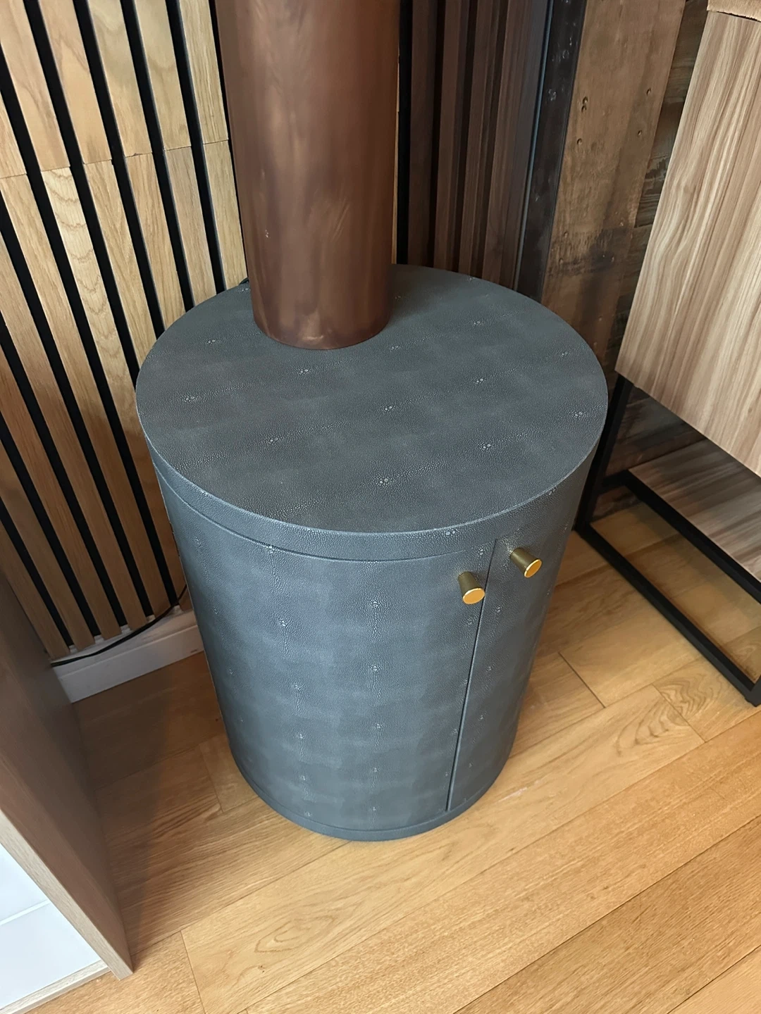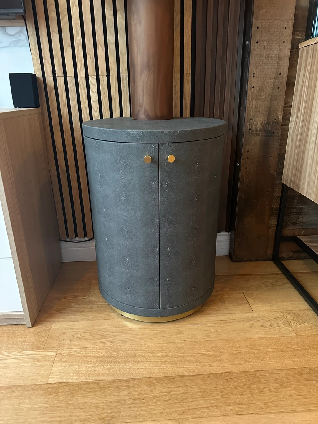 display liquor stand night table storage shelf mid century modern interior design barn antique salvaged coffee home staging props condo size store etc... A brand new home sense cabinet with 2 interior shelves. Exterior is finished in a textured faux leather wrap. Please Note Size: 22 x 26 h ” H inches FRIENDLY BUYER TIPS Pickup king bathurst area or uber courier. First come first serve. Etrans required to hold. Pls view my other ads. Thank you.