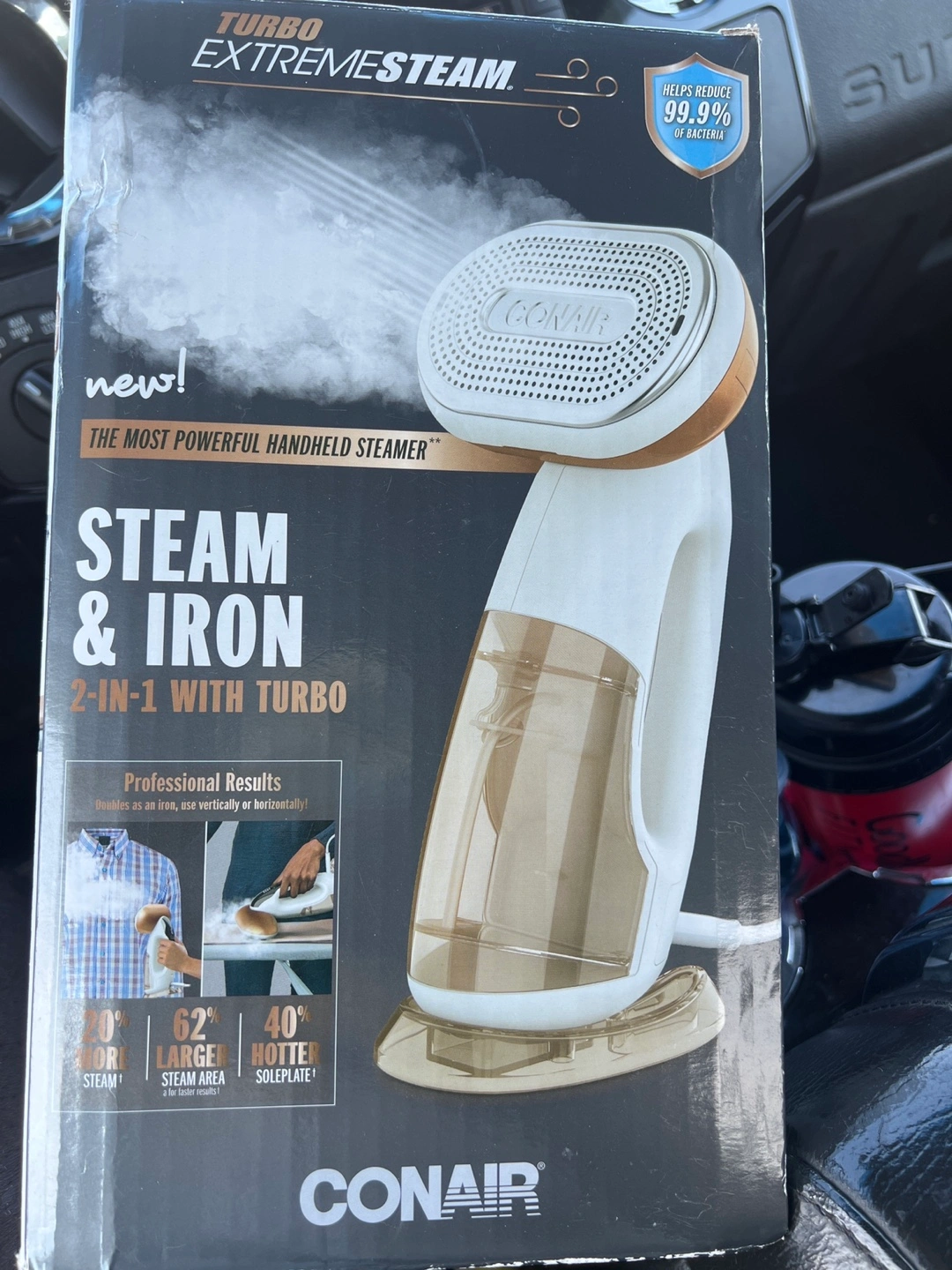 I'm selling a brand new Conair Turbo ExtremeSteam Steam & Iron 2-in-1 with Turbo! It's the most powerful handheld steamer and helps reduce 99.9% of bacteria. It doubles as an iron and can be used vertically or horizontally. The box is included!